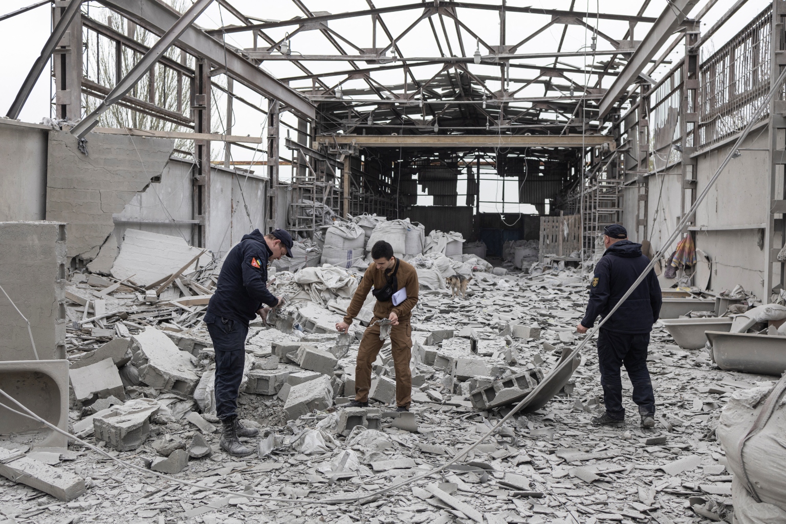 Ukrainian servicemen check the area of a missile strike in Kramatorsk, Donetsk region, on April 19, 2022.
