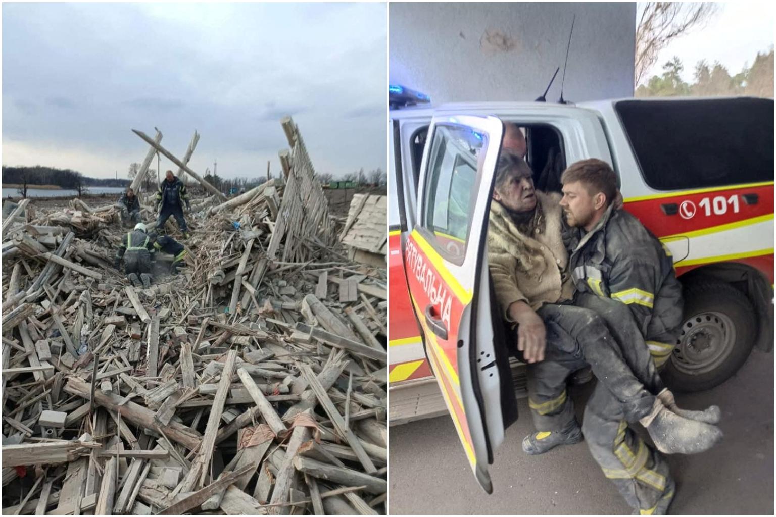 Rescuers carry a woman out of debris after a military strike in the town of Rubizhne on April 6, 2022.