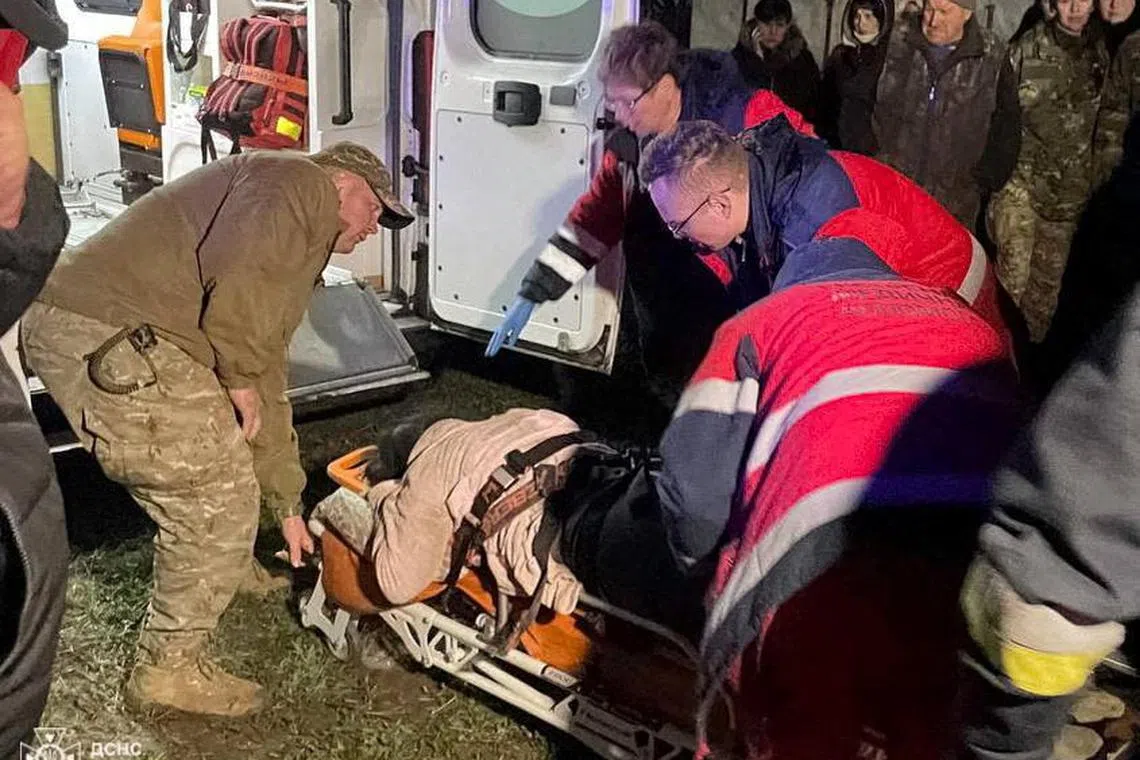 Paramedics carrying an injured person into an ambulance, at the site of a Russian drone strike in Ukraine’s Vinnytsia region.