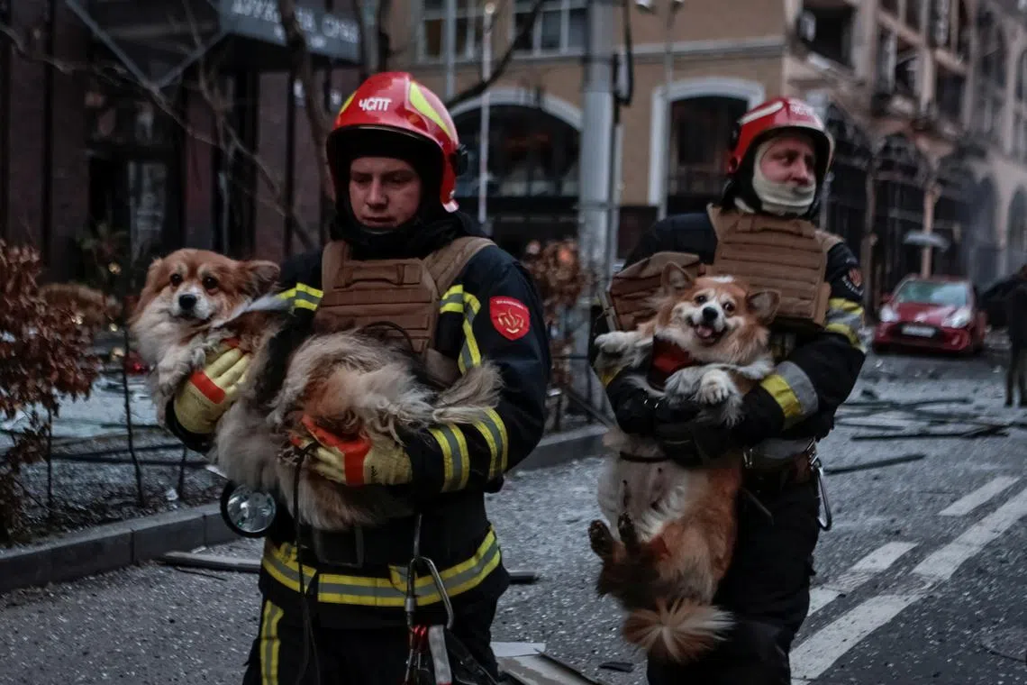 Rescuers helping a resident to evacuate from the site of a Russian missile strike, in central Kyiv, on Dec 20.