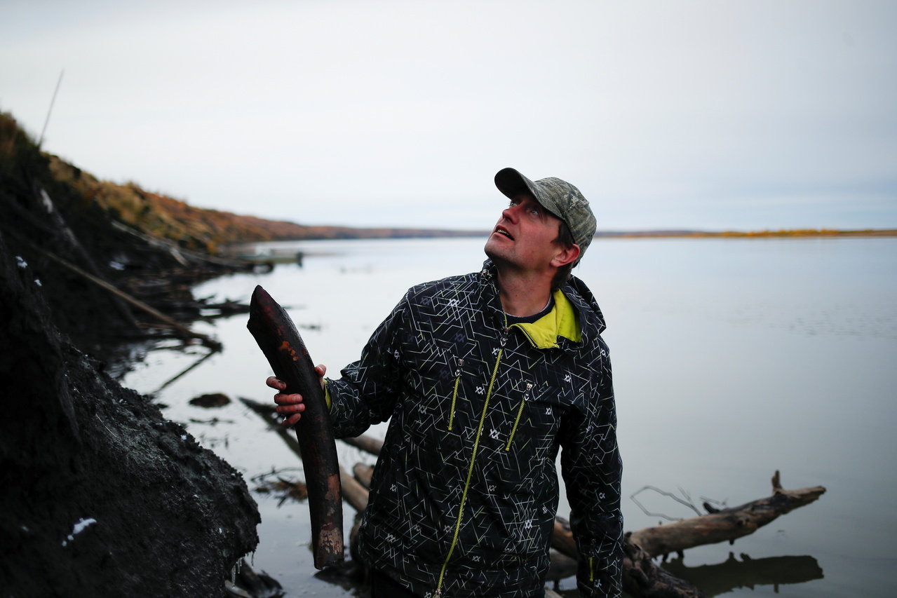Dr Nikita Zimov holding a piece of a mammoth's tusk as he walks along the bank of the Kolyma river at Duvanny Yar in Russia on Sept 12, 2021.