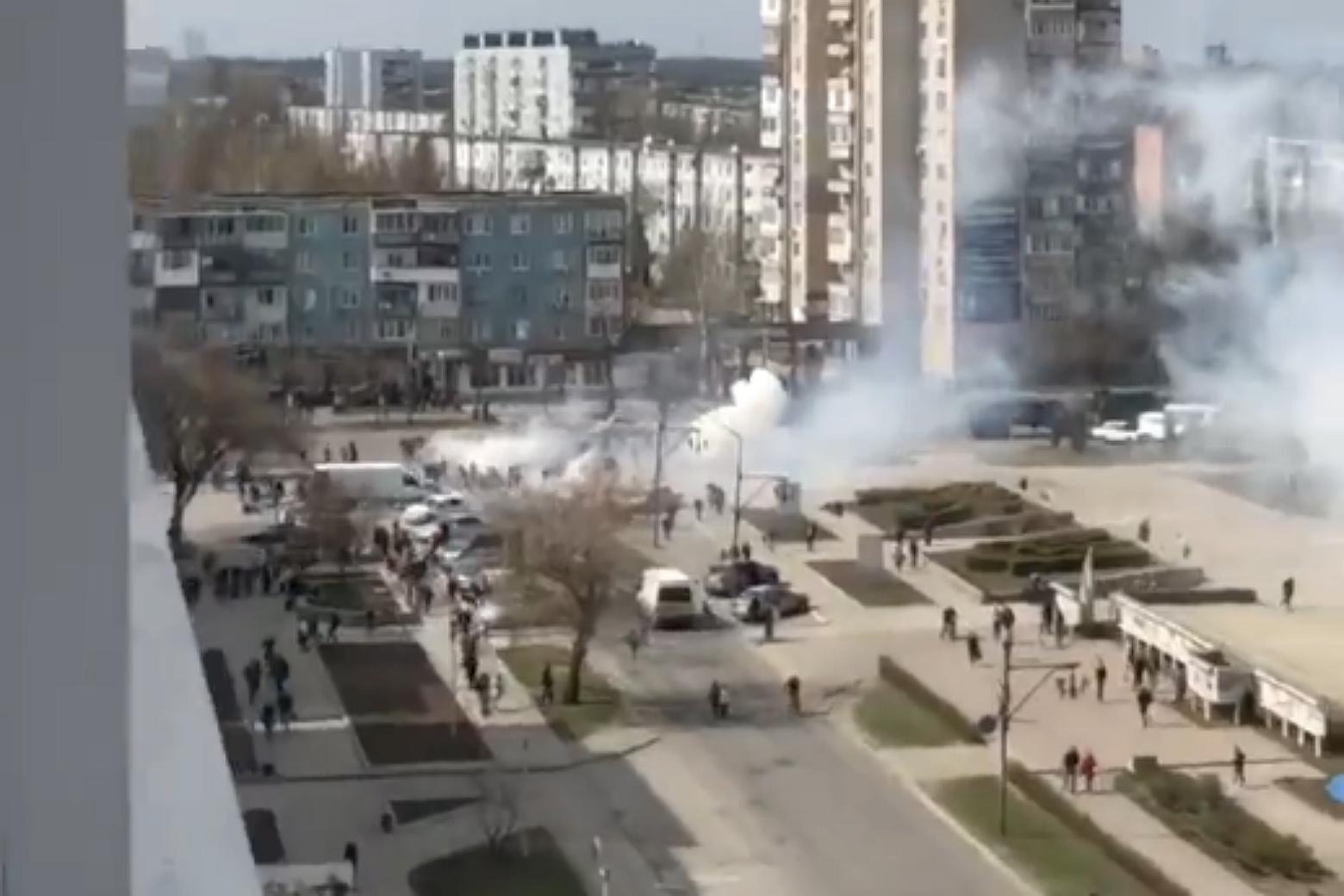 "The occupiers are dispersing the protesters with explosions," it said in a separate post on Telegram, sharing a video of what appeared to be multiple stun grenades landing in a square and letting off bangs and clouds of white smoke next to the town's main cultural centre.