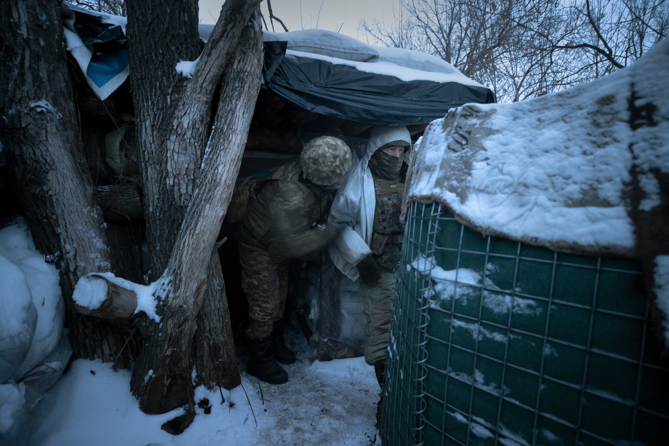 Ukrainian soldiers are pictured at a front-line position in Popasna, Ukraine on Jan 26, 2022.