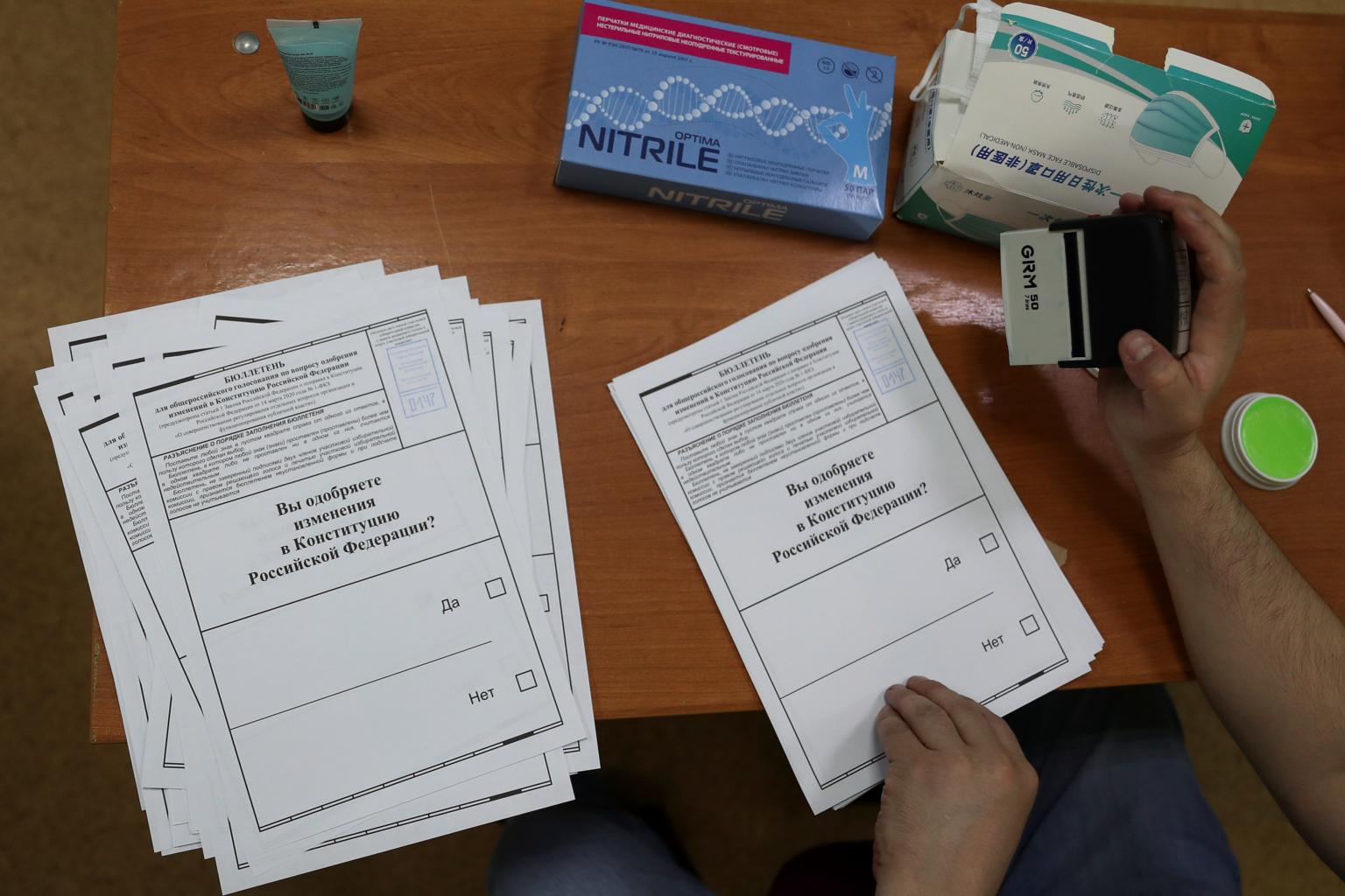 A member of a local electoral commission puts stamps on ballots at a polling station in Moscow, on June 23, 2020.