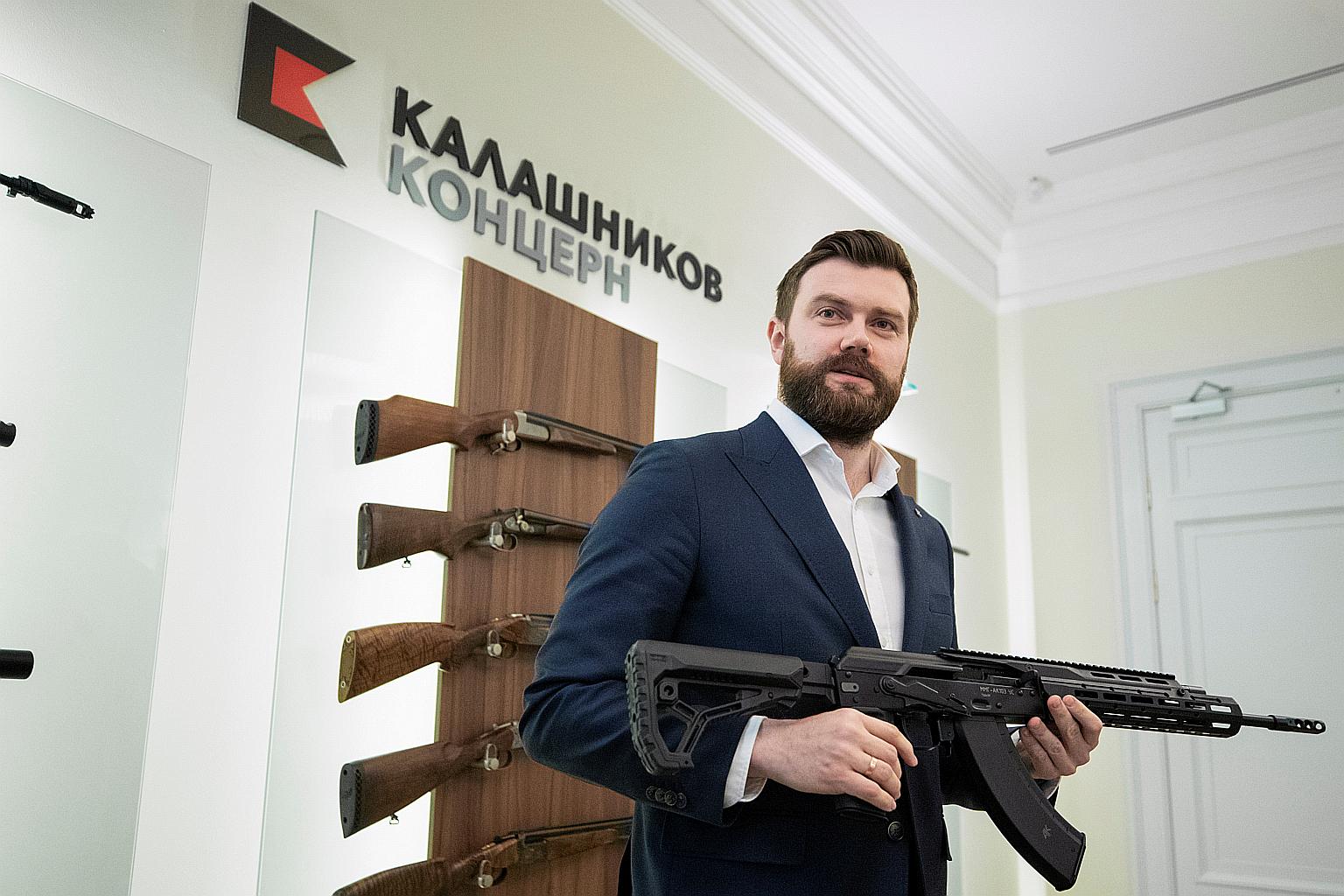 Kalashnikov CEO Dmitry Tarasov showing off one of his company's weapons during an interview in Moscow on Feb 8, 2021.