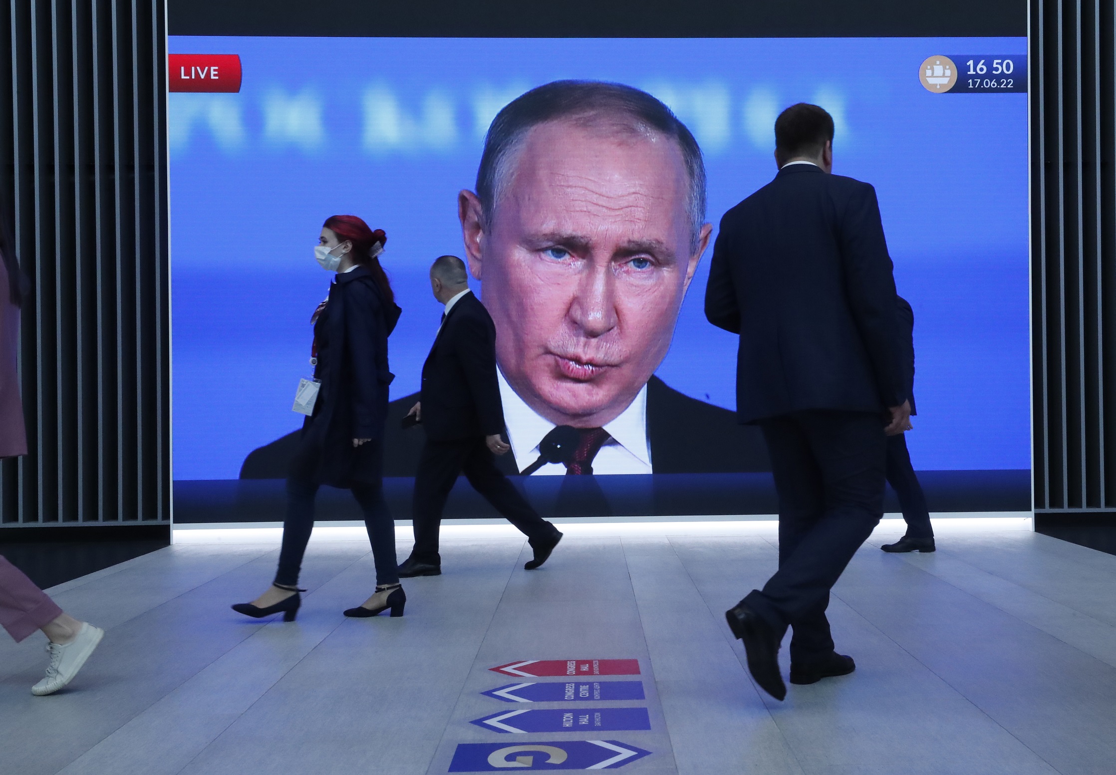 Russian President Vladimir Putin delivers a speech onscreen at the St Petersburg forum.