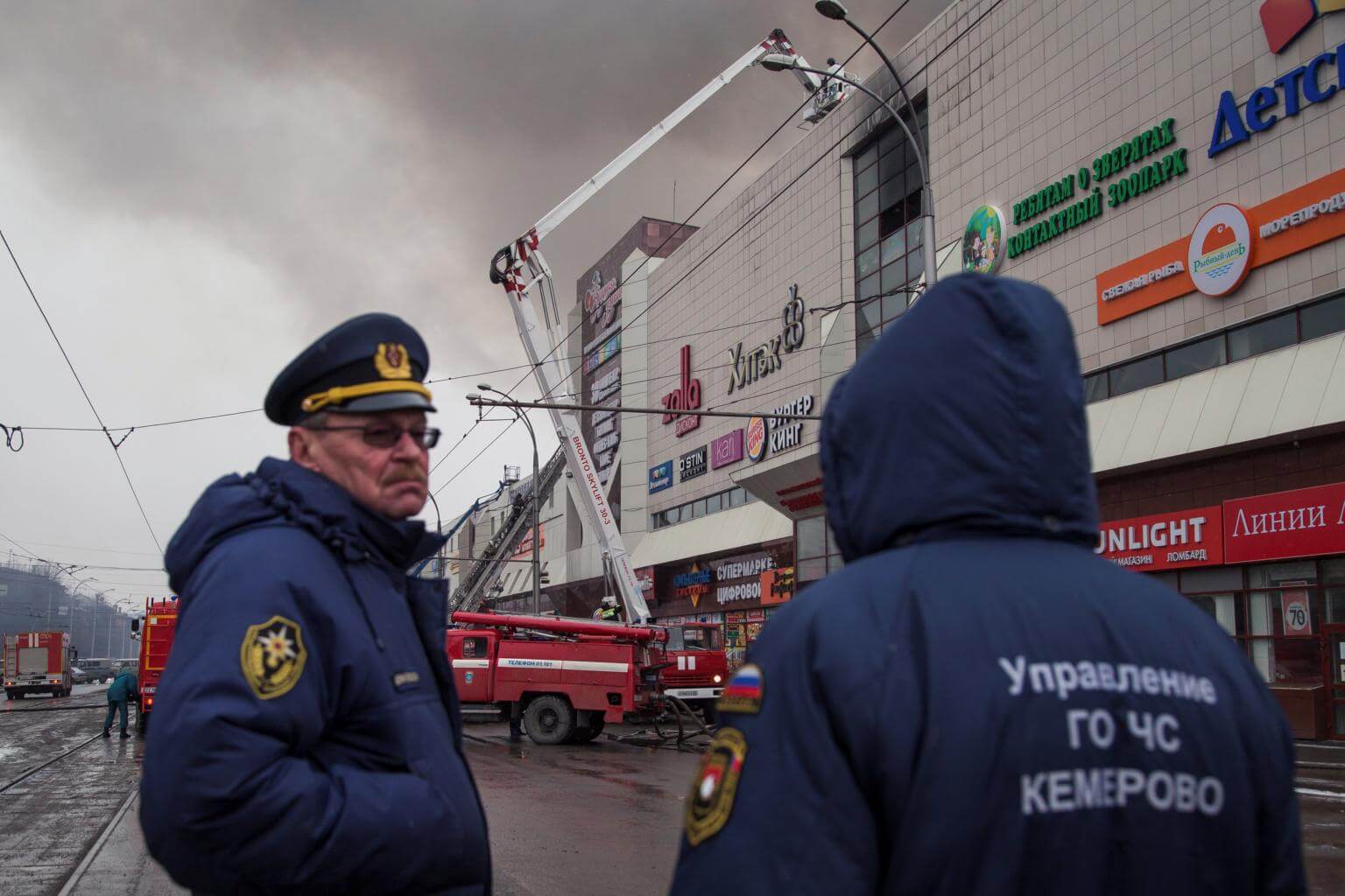 Members of the Emergency Situations Ministry working at the scene of a fire in a shopping mall in the Siberian city of Kemerovo, Russia, on March 25, 2018.