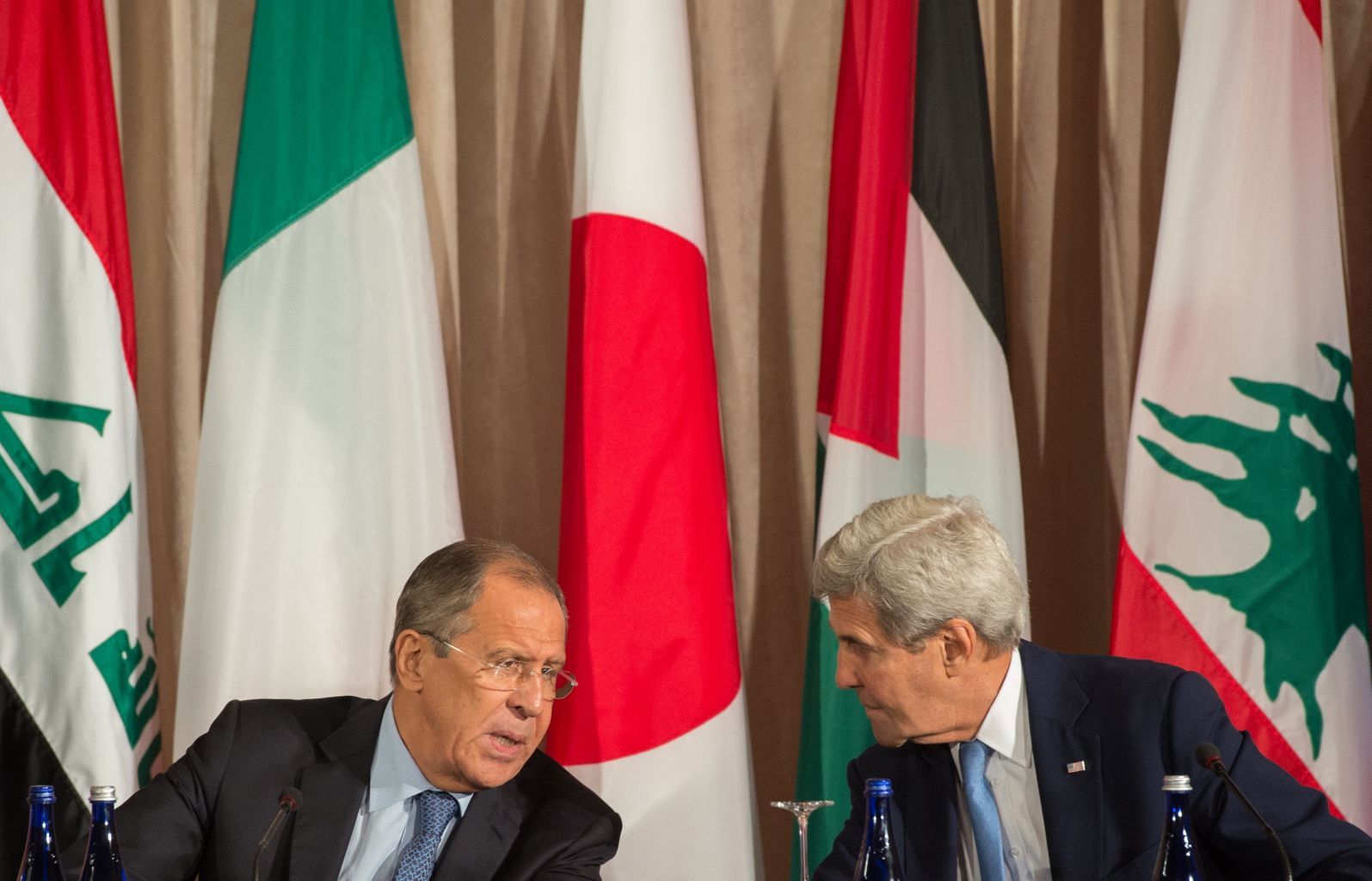 A 2016 photo shows Lavrov (left) and Kerry speaking at an event in New York.