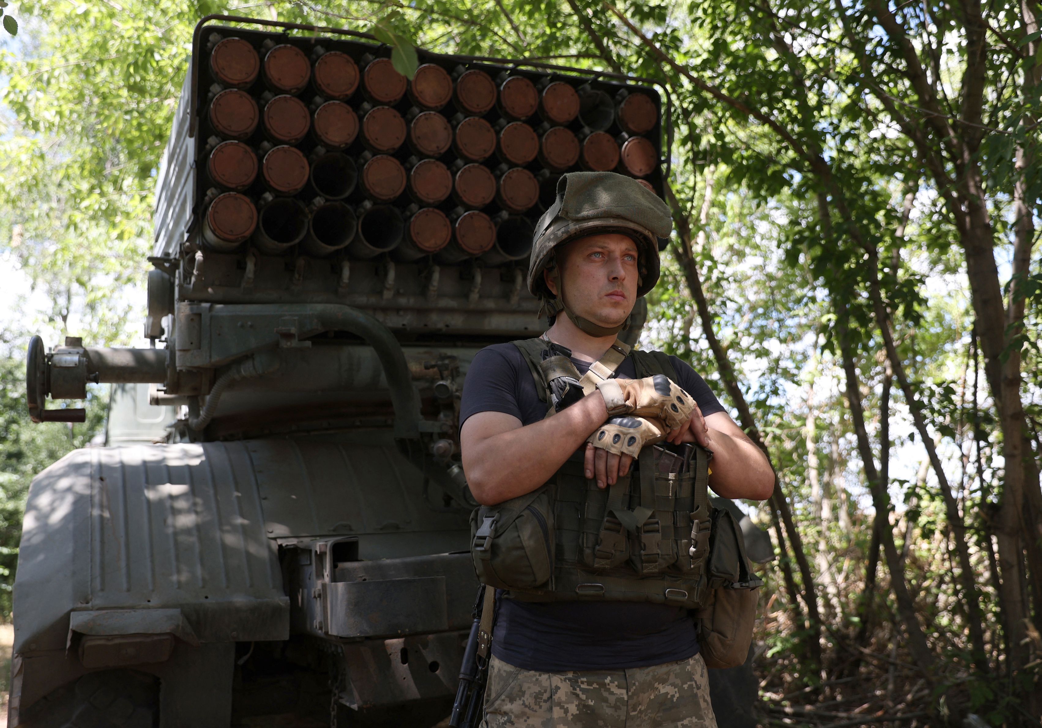 A Ukrainian serviceman stands by a Grad BM-21 multiple rocket launcher at the Donbas front line.