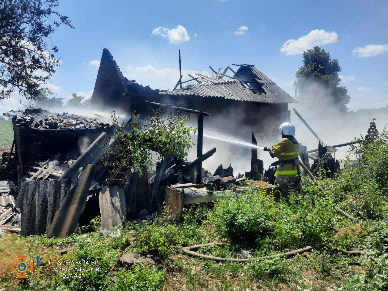 Firefighters dousing a house with water, following shelling in the Mykolaiv region.