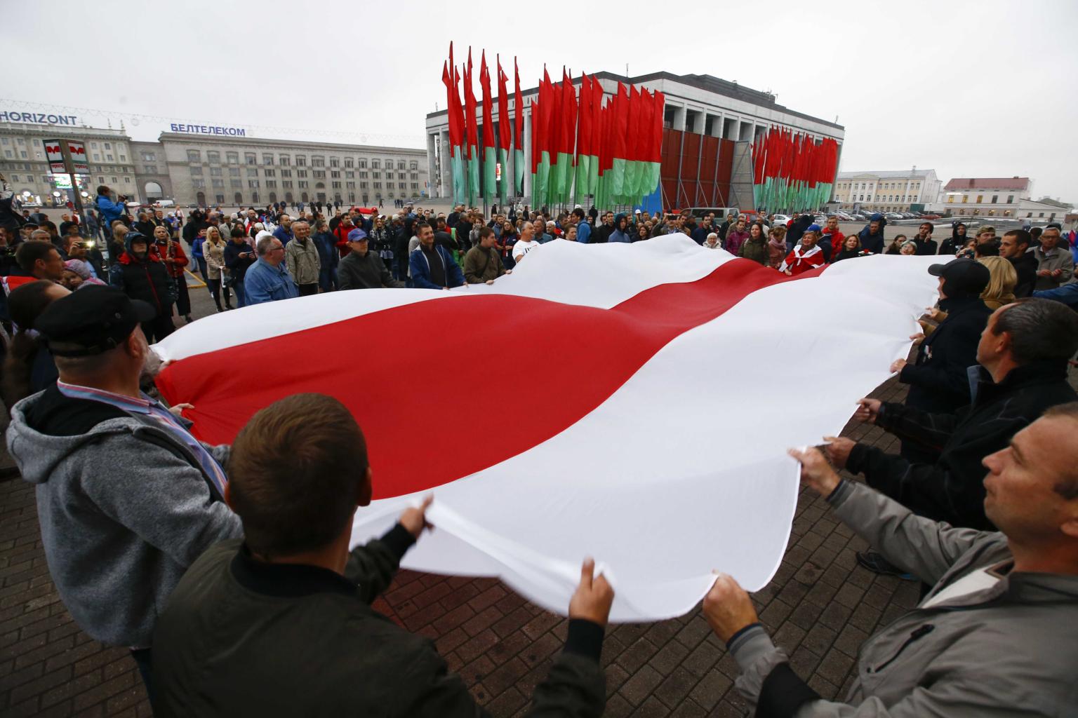 People take part in a rally to protest against the upcoming Zapad-2017 war games in Minsk, Belarus on Sept 8, 2017.