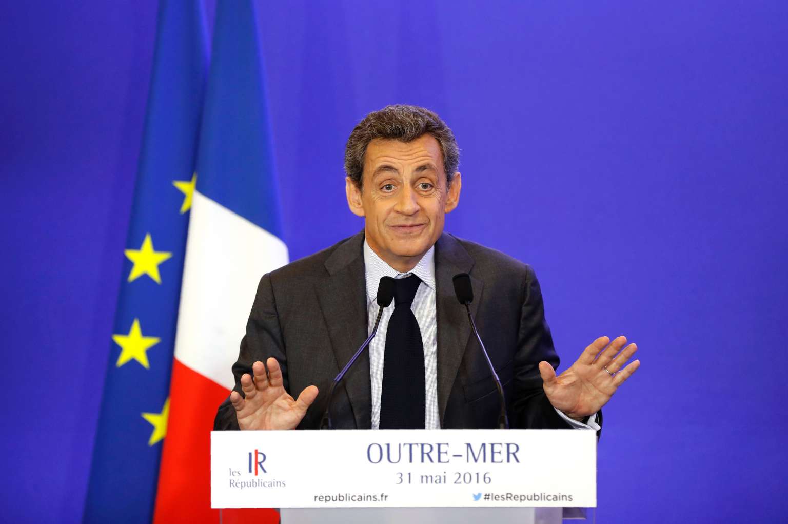 Former president Nicolas Sarkozy gestures as he delivers a speech in Paris, on May 31, 2016.