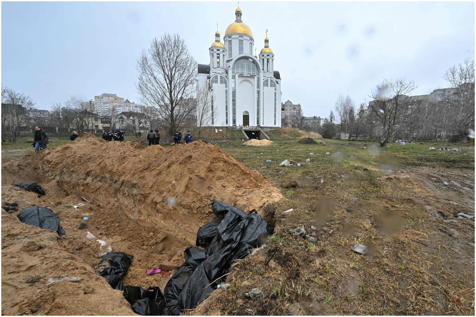 A mass grave is seen behind a church in the town of Bucha, northwest of the Ukrainian capital Kyiv on April 3, 2022.