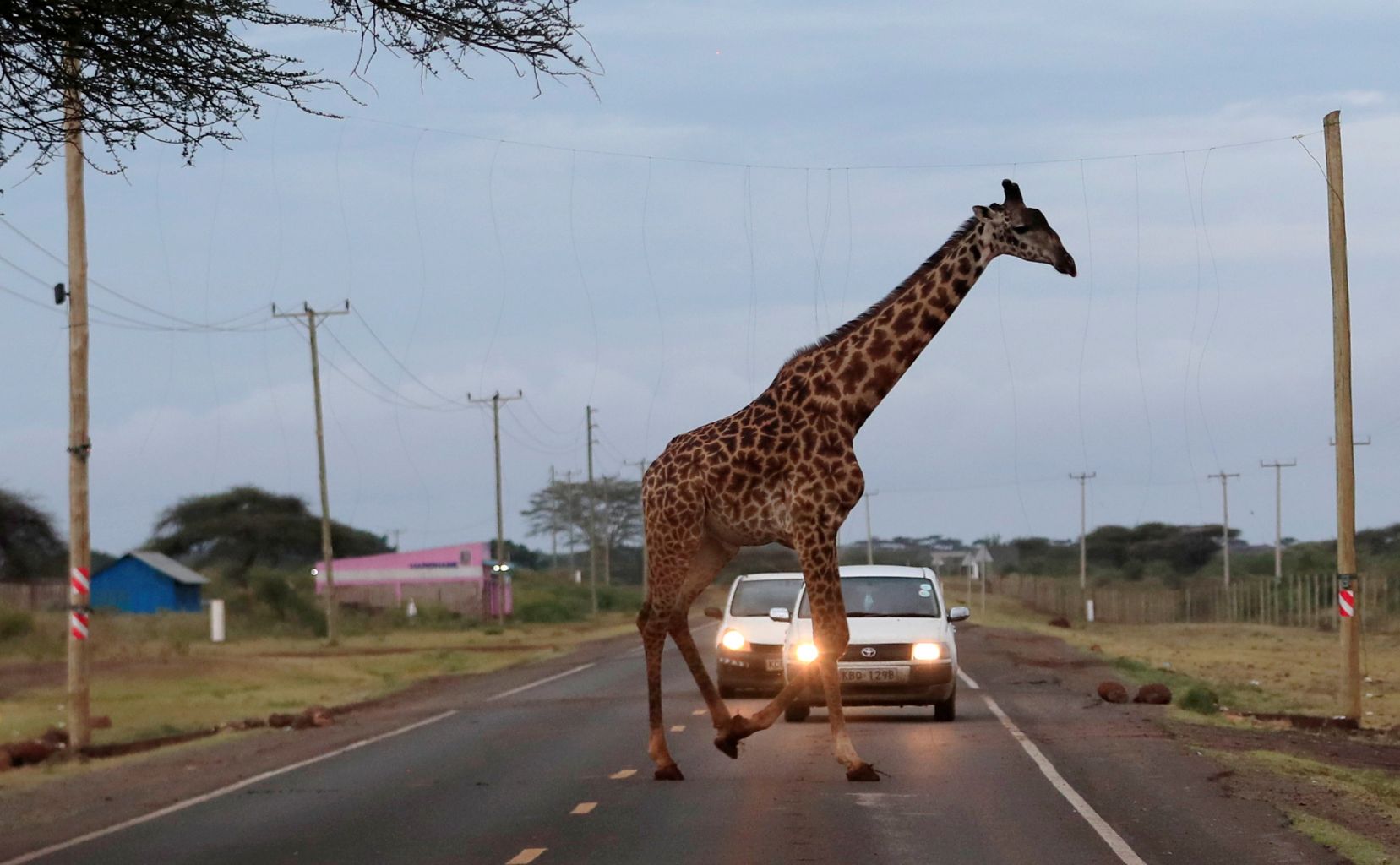 A giraffe crosses a road within the Kimana Sanctuary in Kenya, part of the Amboseli ecosystem, on Feb 8, 2021.