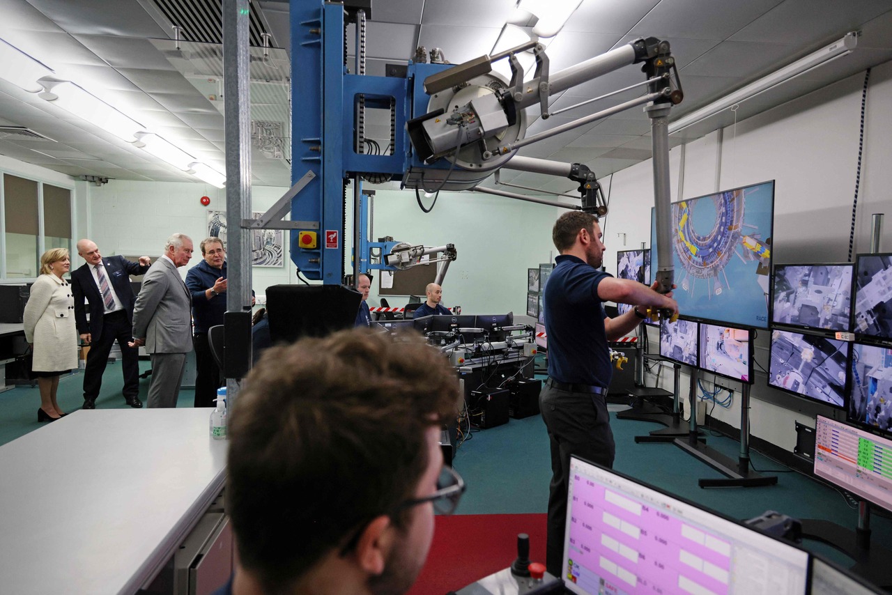 Britain's Prince Charles is shown equipment in the remote handling control room at the UK Atomic Energy Authority in Culham, near Abingdon, on Jan 31, 2022.