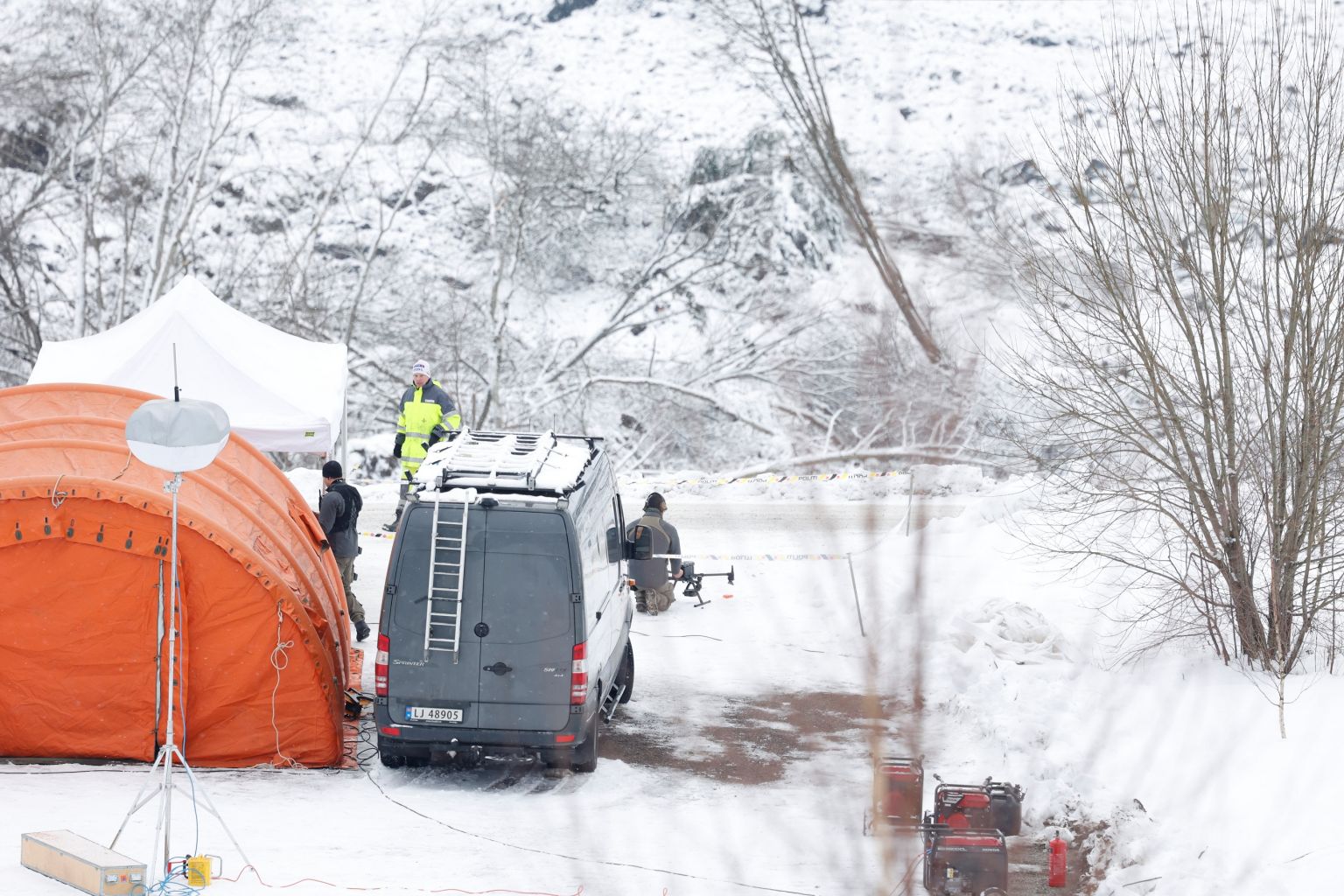 Rescue crews work with a drone in the landslide area at Ask, Gjerdrum, Jan 2, 2021.