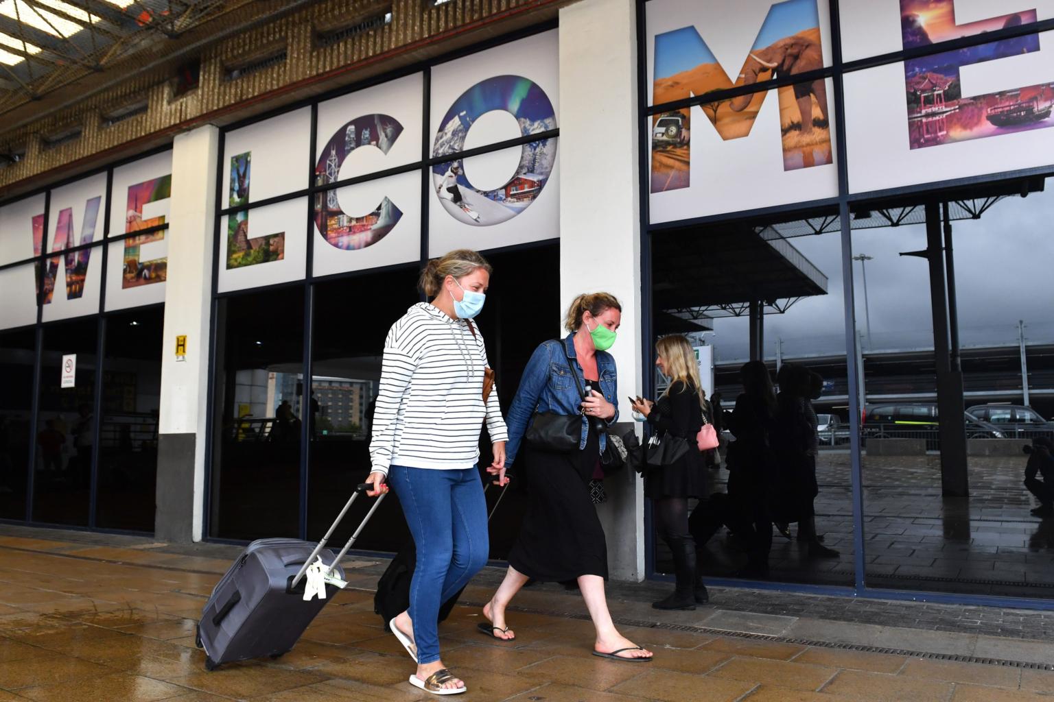 Passengers exit the terminal after landing at Manchester Airport on July 27, 2020.