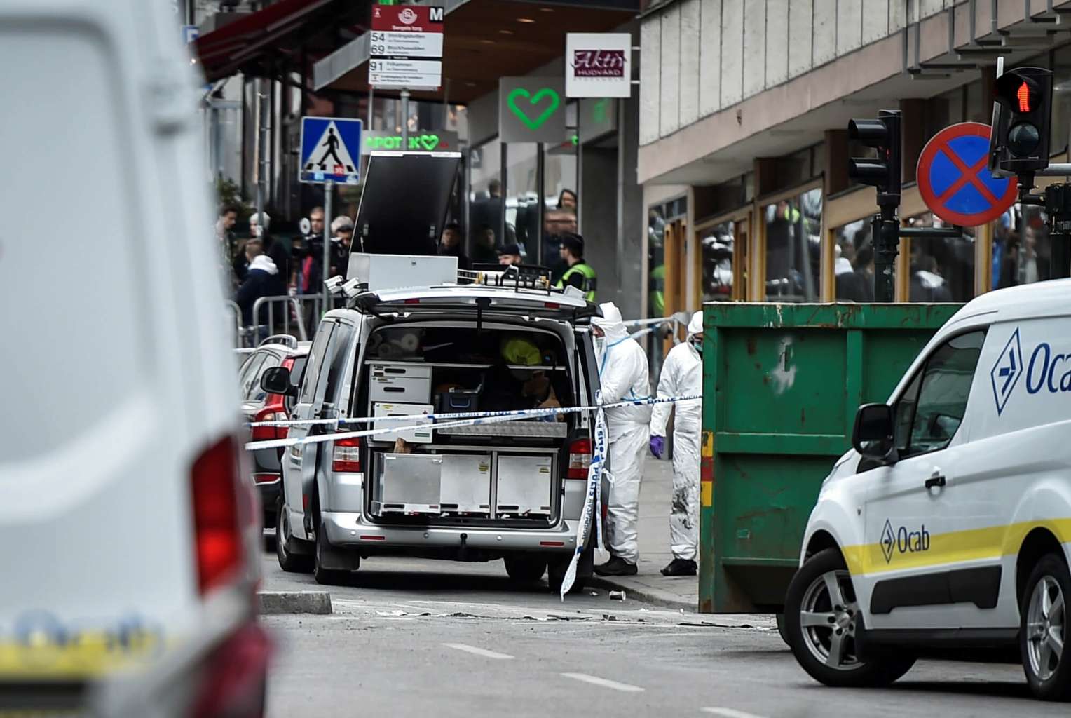 Forensic police investigators work at the crime scene in central Stockholm on April 8, 2017, a day after a truck plowed into pedestrians on Drottninggatan.
