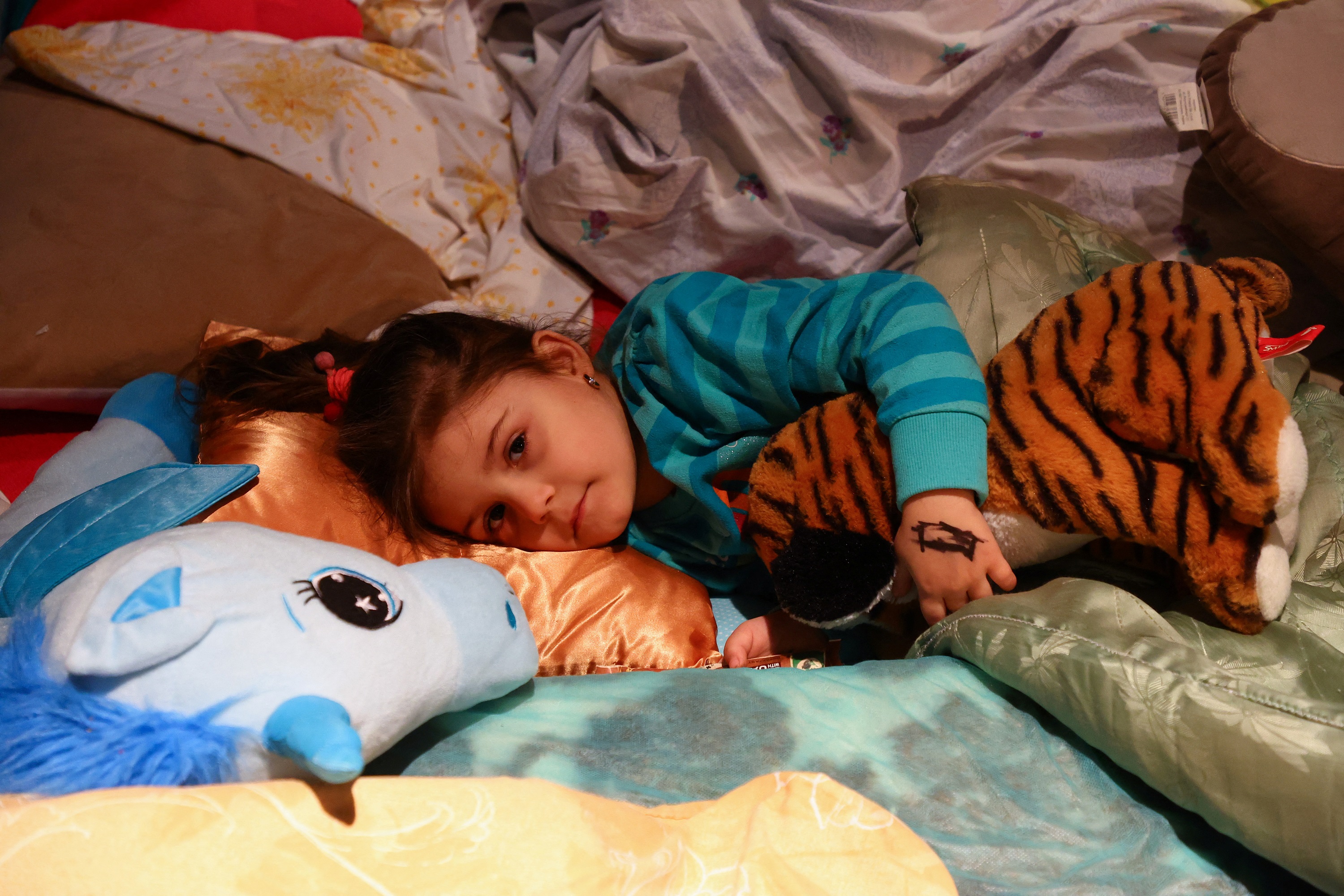 A refugee child rests at a theatre hall in Poland, transformed into temporary accommodation for people fleeing of Ukraine, on March 18, 2022.