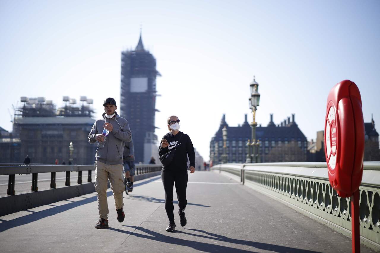 Pedestrians walk along Westminster Bridge in a quiet central London, on March 25, 2020.