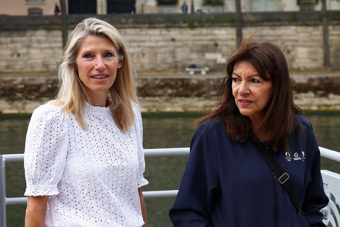 French Minister for Sports, Youth, and Community Life Marie Barsacq (left) and Paris Mayor Anne Hidalgo stand on the banks of the River Seine on July 5.