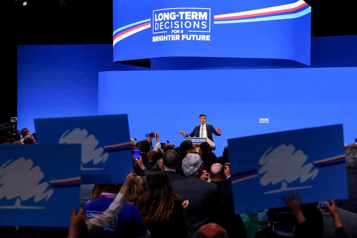 British Prime Minister Rishi Sunak speaking at the Conservative Party’s annual conference in Manchester on Oct 4.
