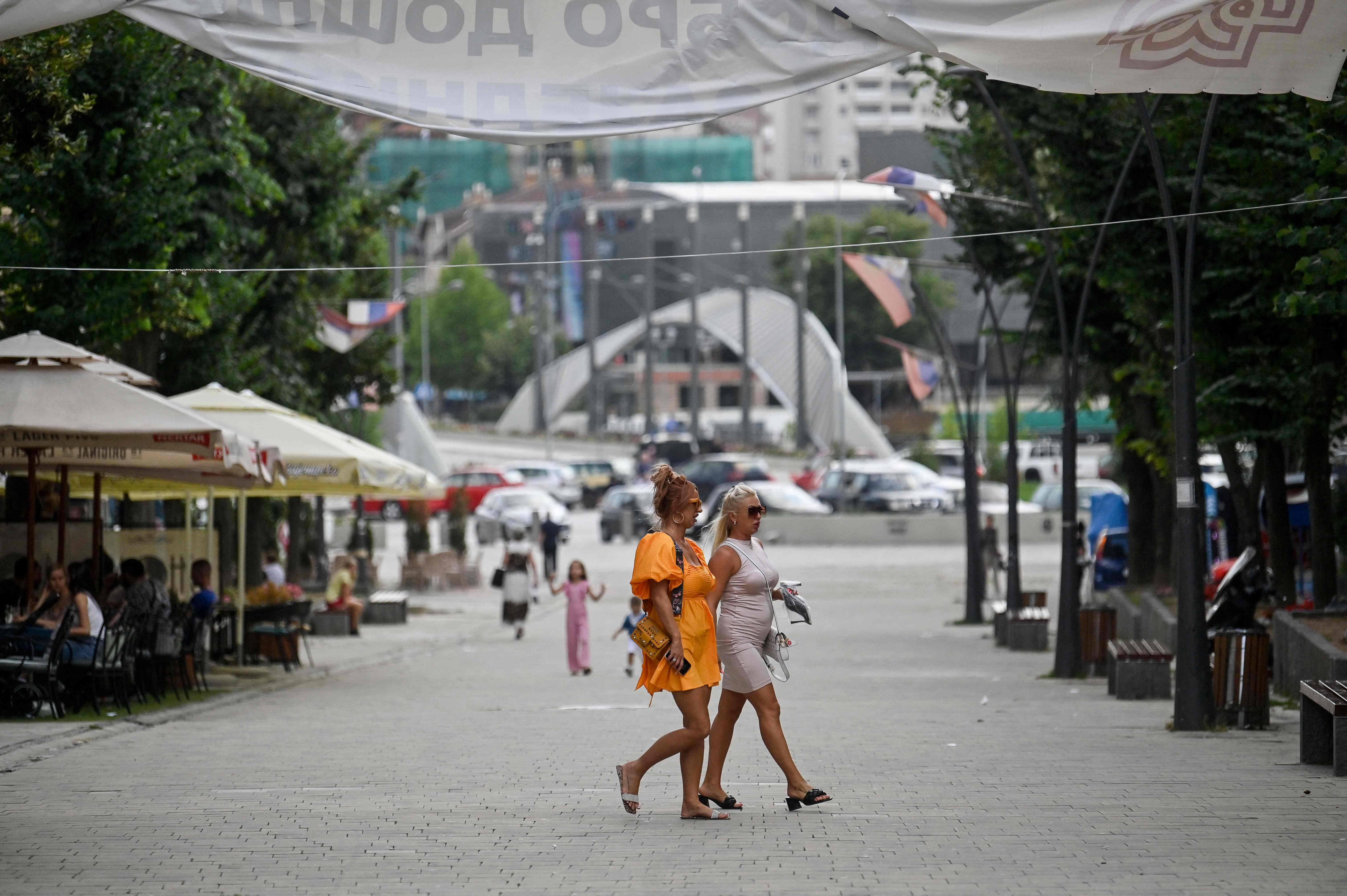 Serb women walk through the main square, in the Serb majority north of Kosovo's Mitrovica, on Aug 26, 2022.
