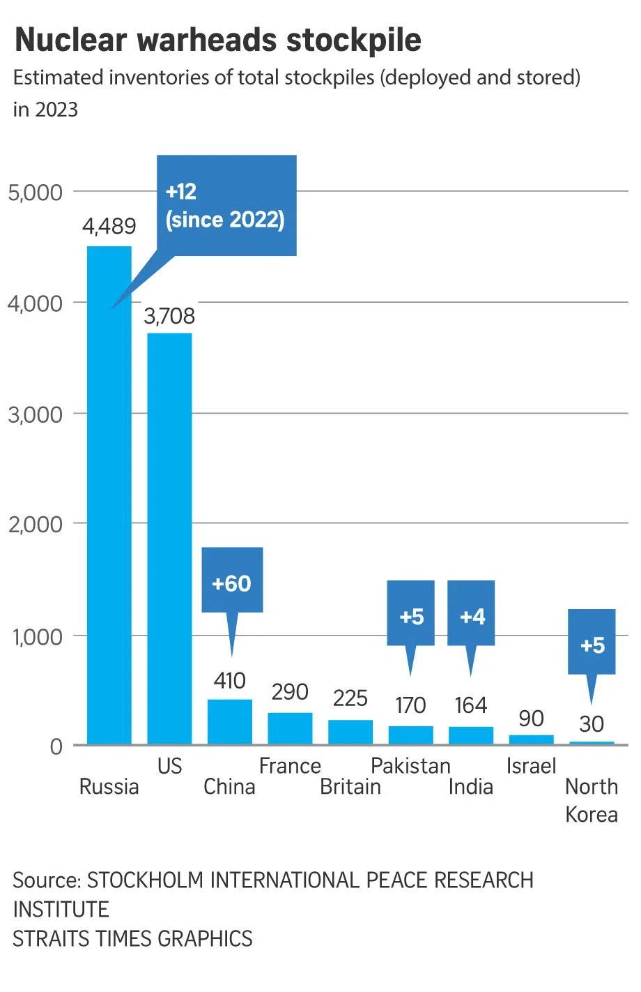 The Stockholm International Peace Research Institute (Sipri), meanwhile, released a report showing that the total number of nuclear warheads held by Britain, China, France, India, Israel, North Korea, Pakistan, Russia and the US was down at 12,512 at the outset of 2023, from 12,710 at the start of 2022.