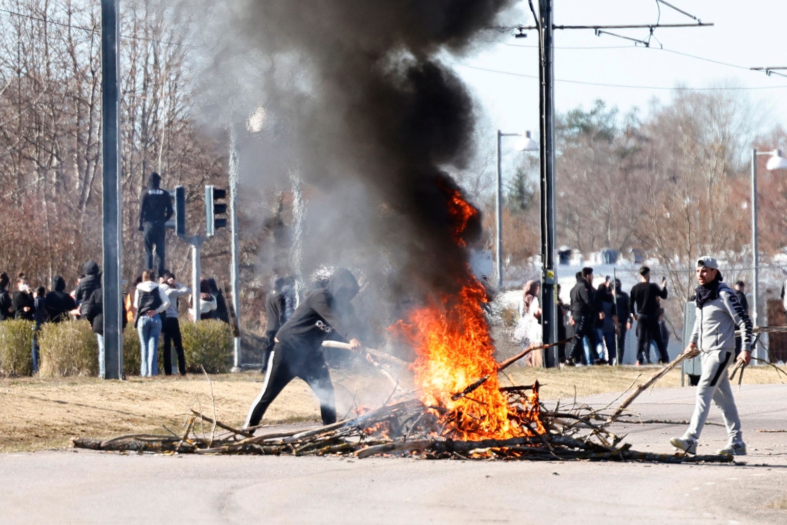 Protesters build a burning barricade on a street during rioting in Norrkoping, Sweden, on April 17, 2022.