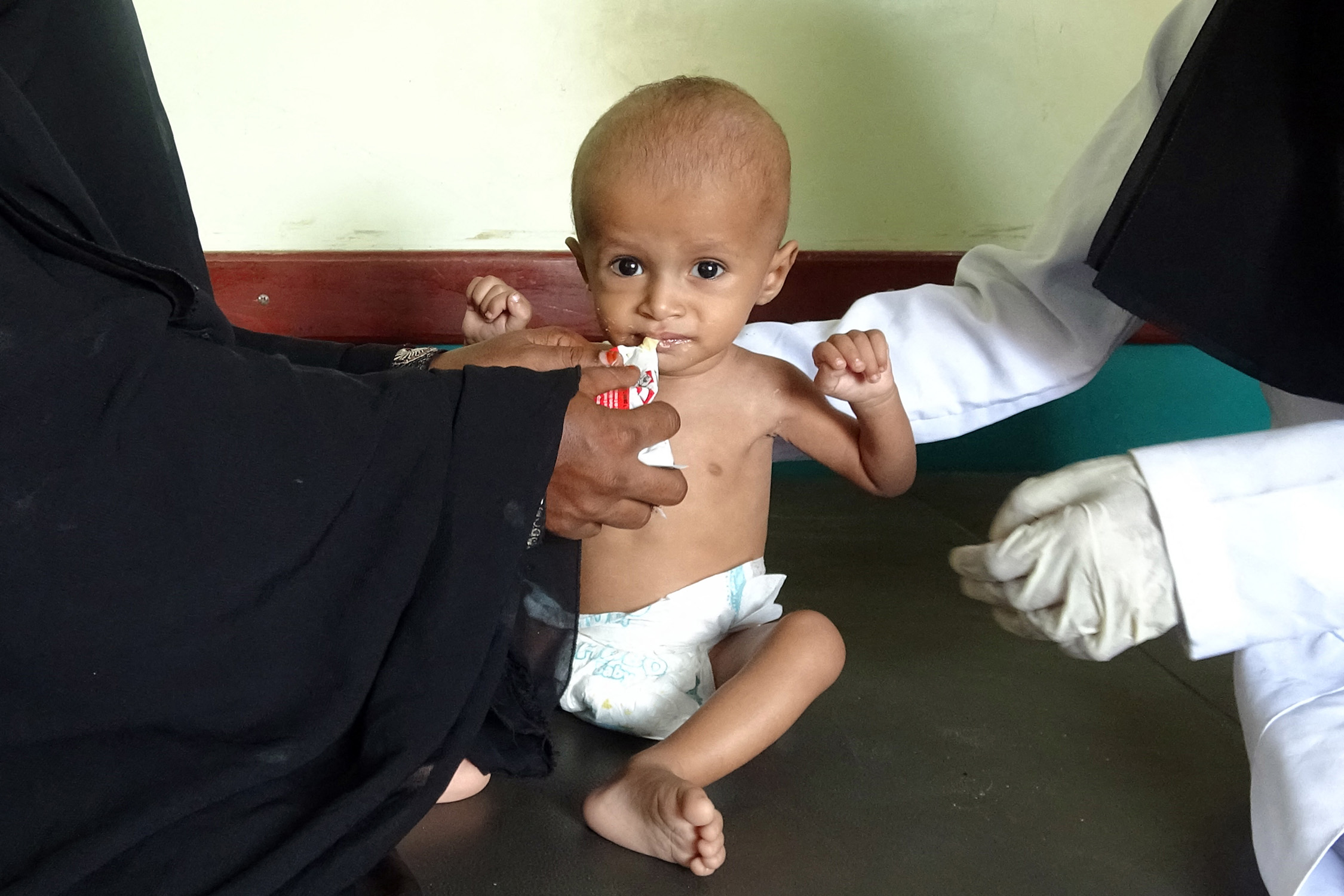 An 18-month-old Yemeni child suffering from malnutrition being fed at a treatment centre in Yemen on Nov 6, 2021.