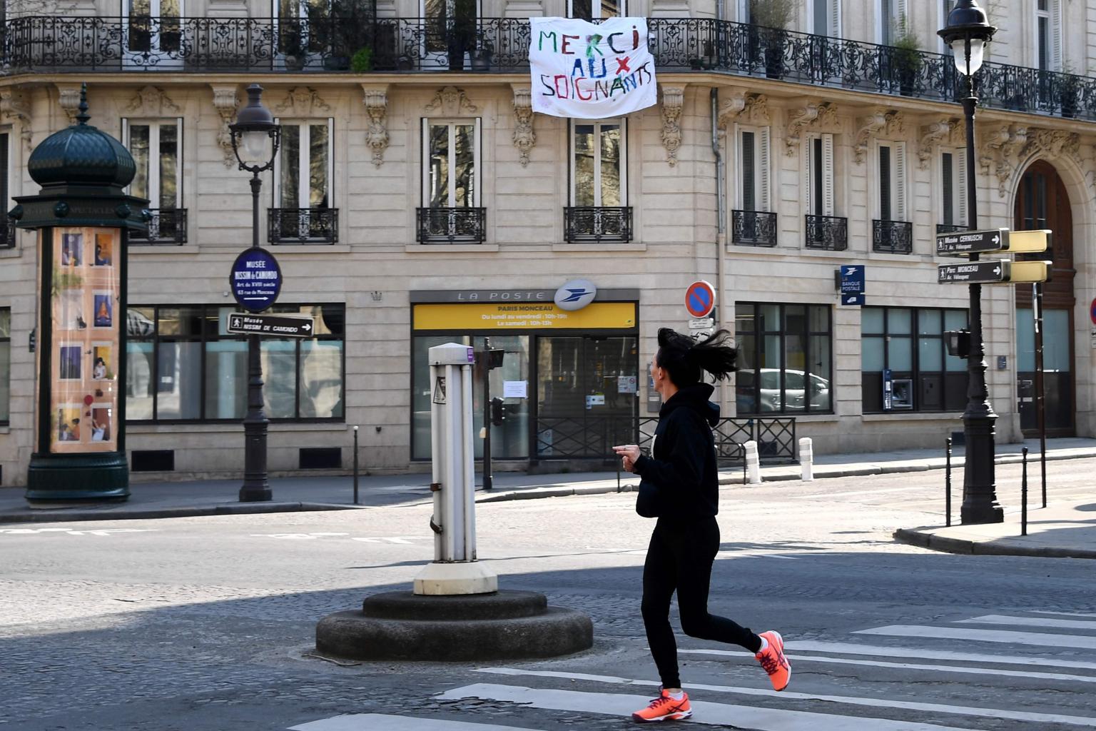 A jogger runs in the street near a sign hanging from a balcony thanking medical workers, in Paris, on March 27, 2020.