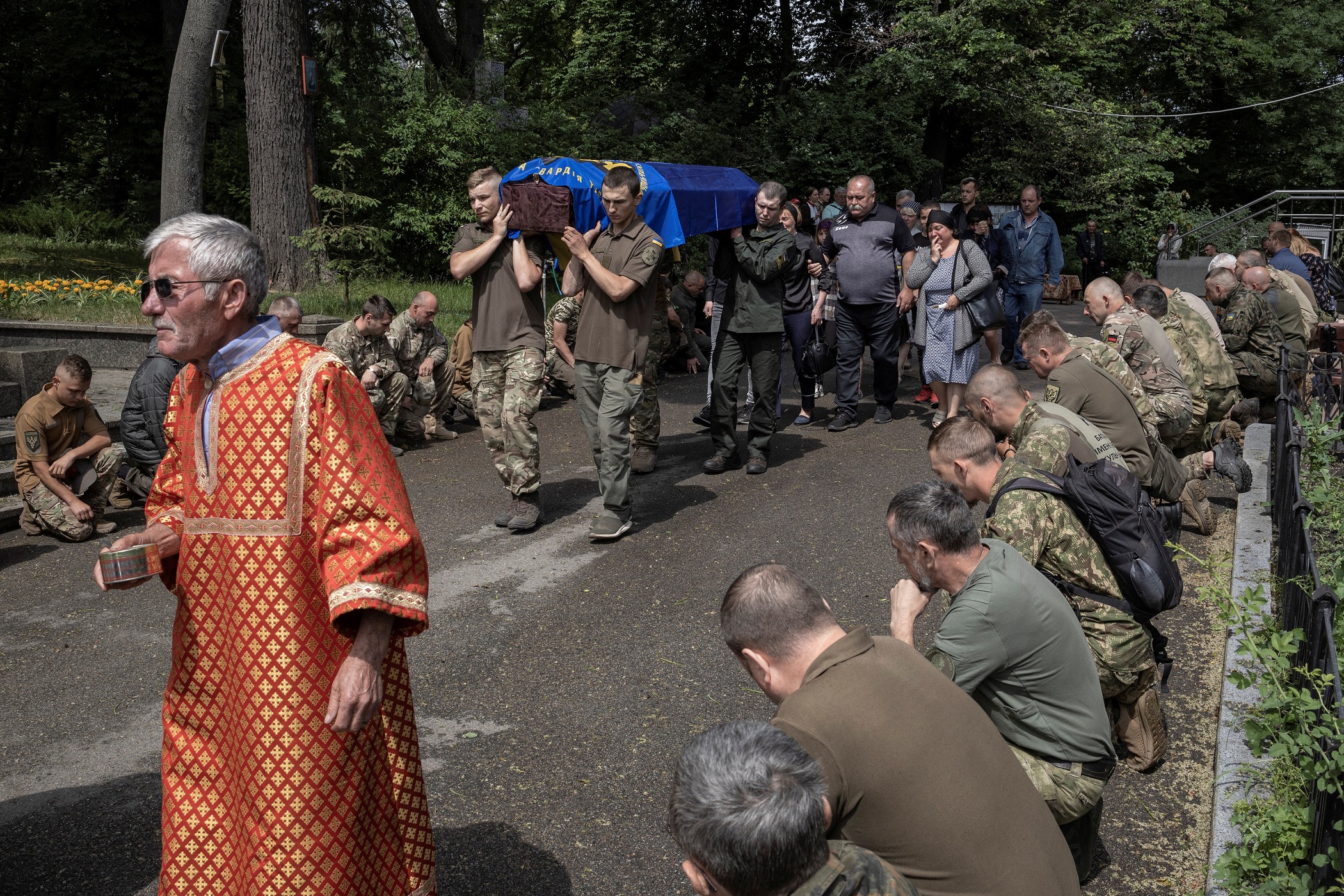 Familly and friends attend a memorial service in Kyiv for Ukrainian serviceman Mykhailo Tereshchenko, who was killed during fighting in the Donbas region of Ukraine.