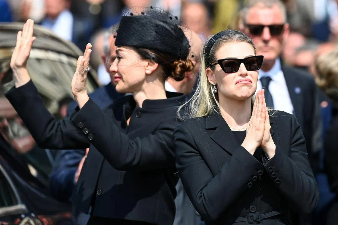 Mr Silvio Berlusconi’s daughters Eleonora (left) and Barbara acknowledging the crowd’s applause at the end of the funeral, outside the Duomo cathedral in Milan.