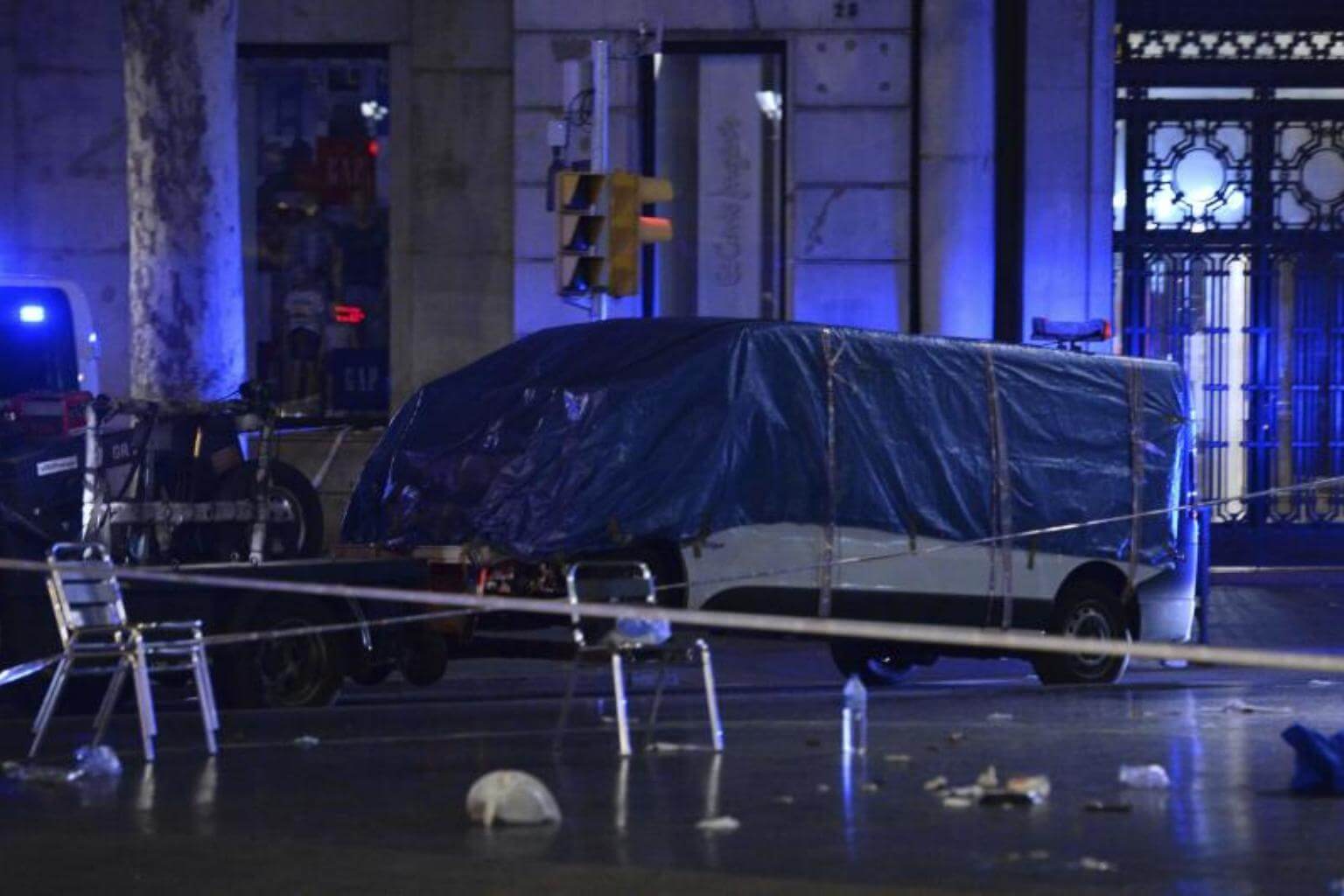The van who ploughed into the crowd, killing at least 13 people and injuring around 100 others is towed away from the Rambla in Barcelona on Aug 18, 2017.