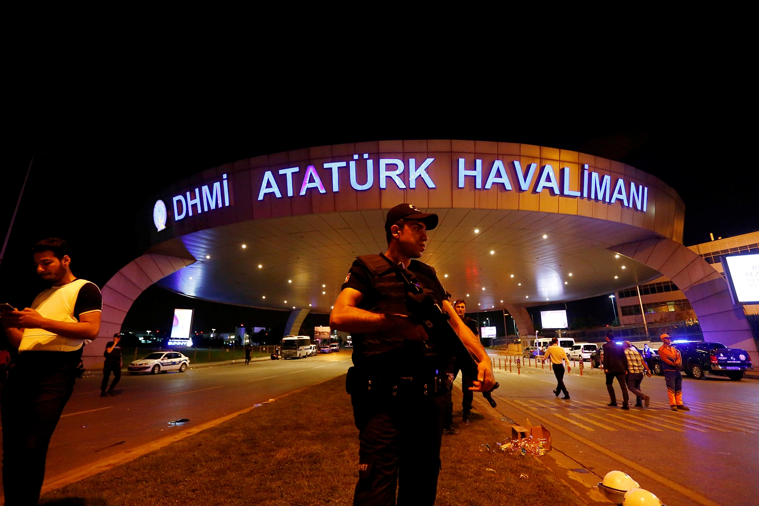 A riot police officer stands guard at the entrance of the Ataturk airport in Istanbul, Turkey.