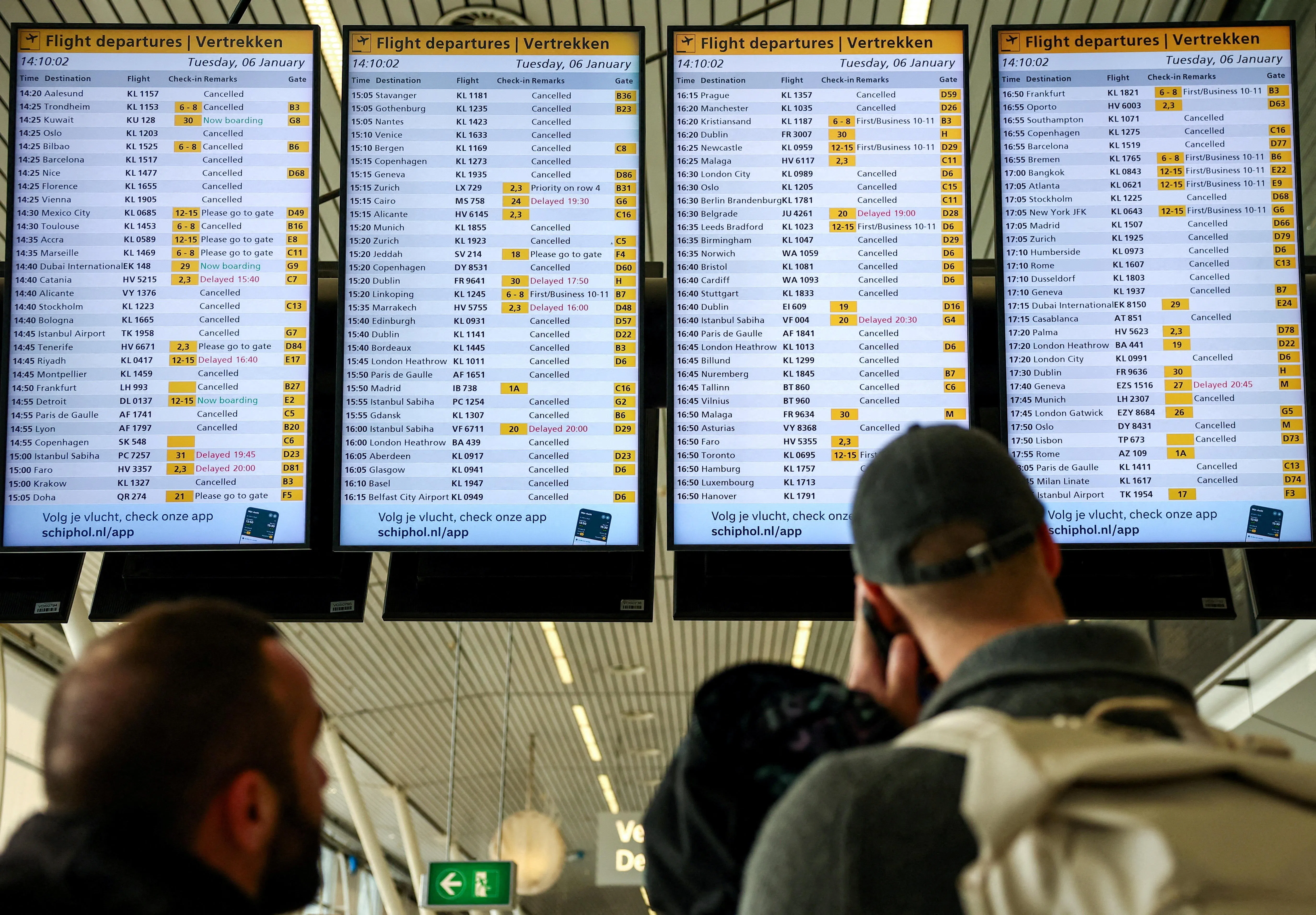 People looking at departure screens showing delayed and cancelled flights at Amsterdam’s Schiphol airport on Jan 6.