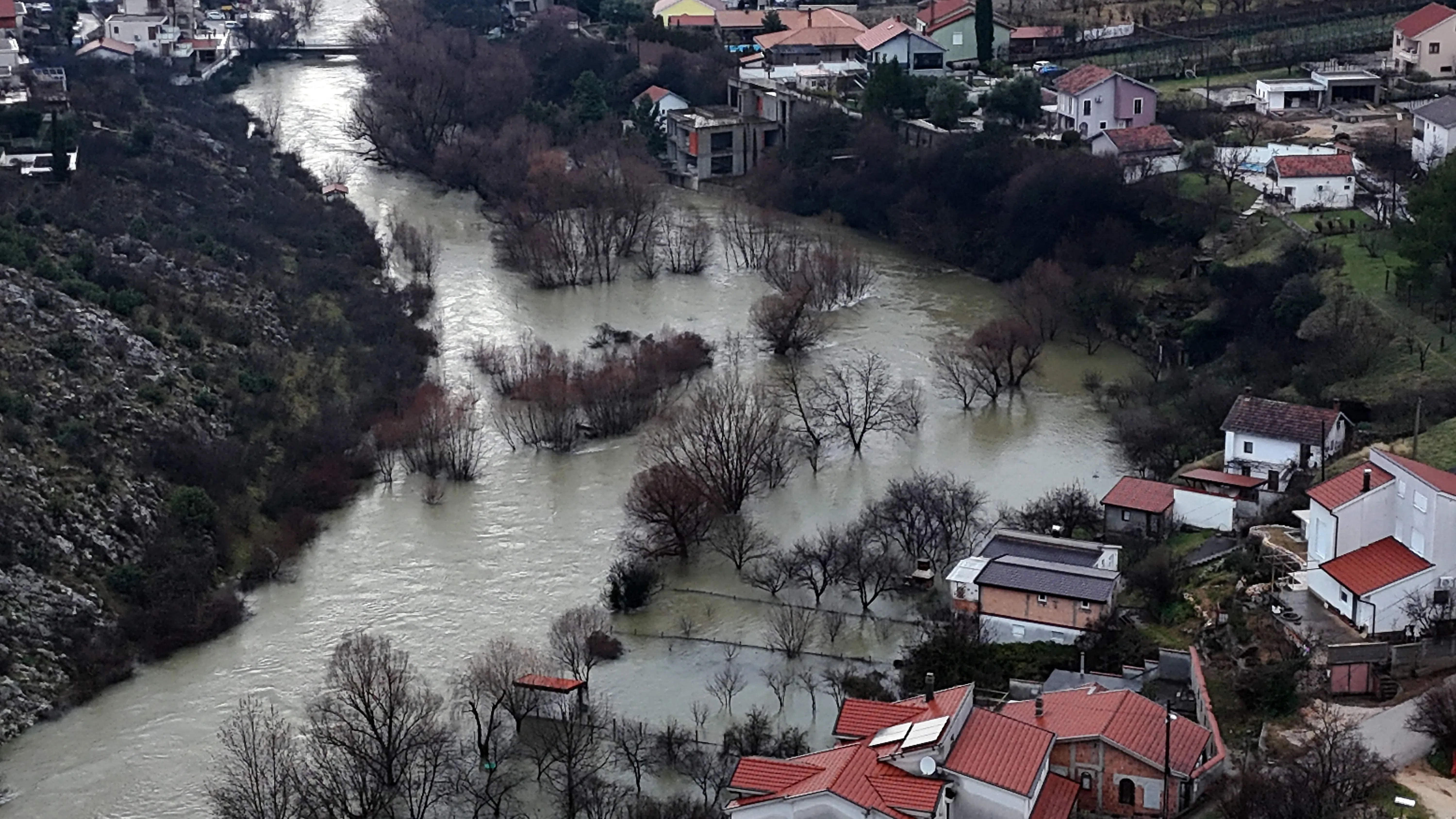 An aerial photograph shows flooded streets following heavy rain in the southern Bosnian town of Blagaj on Jan 6.