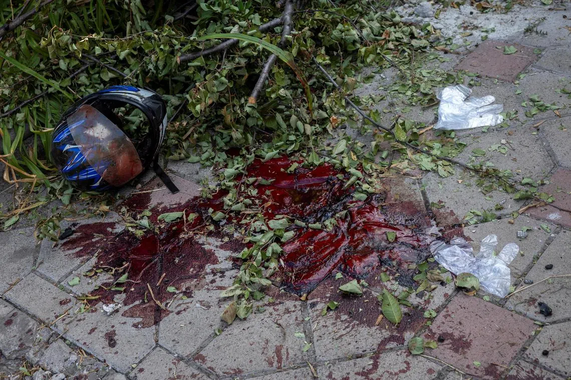A helmet lying next to a pool of blood after a Russian strike on a residential area in Pokrovsk, Ukraine.