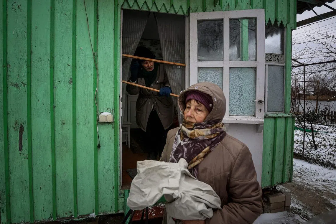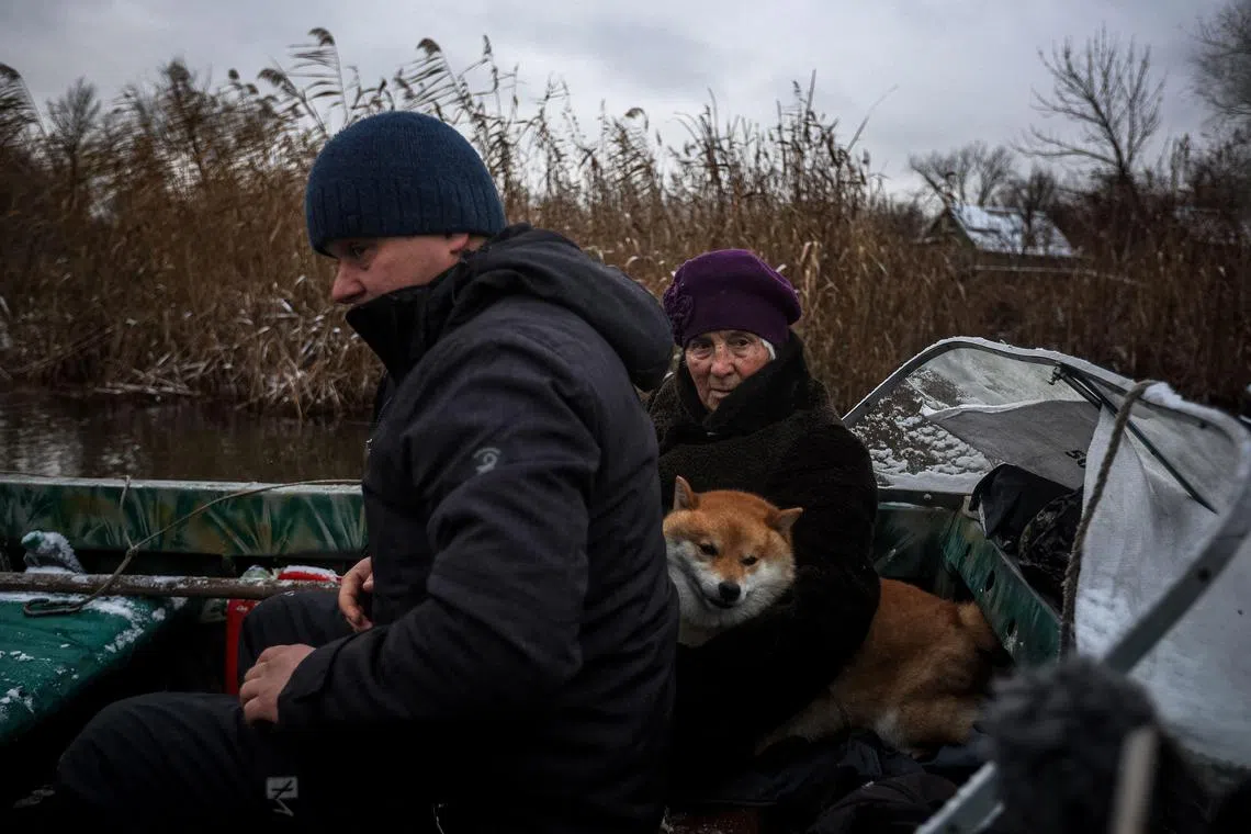 Icy winds buffet the boat and freezing water splashes over its side for 40 minutes until Mr Kovbasyuk arrives and meets Mr Oleksandr Sokolyk, a 64-year-old pensioner, also shuttling people to the mainland.