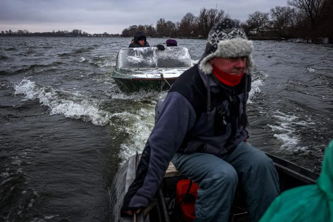 Mr Oleksiy Kovbasyuk, 47, tows a boat carrying his neighbours on the Dnipro river, as he evacuates people from Potemkin island near Kherson.