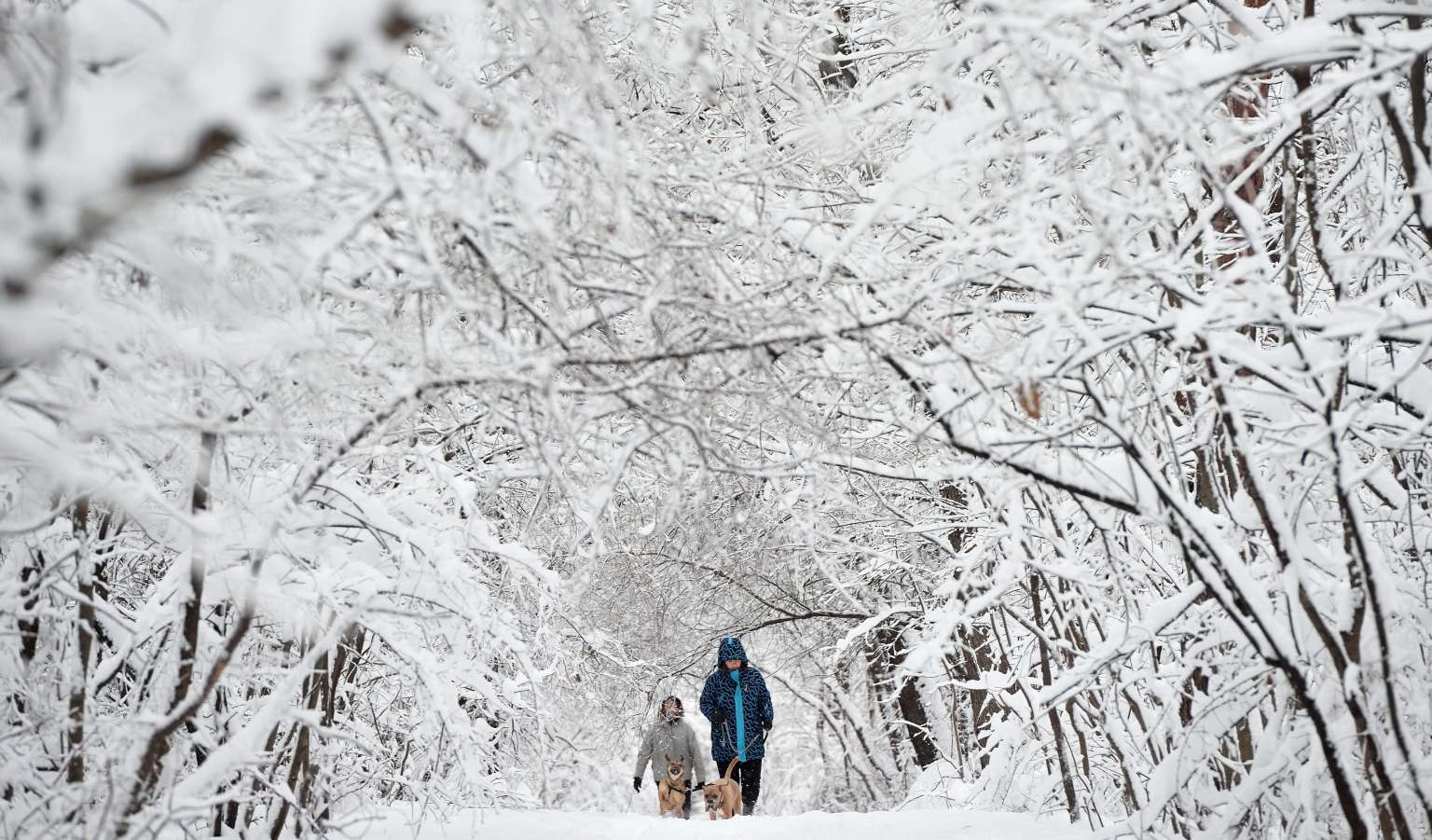 People walk with dogs through a park during snowfall in Sofia, Bulgaria on Jan 17, 2016.