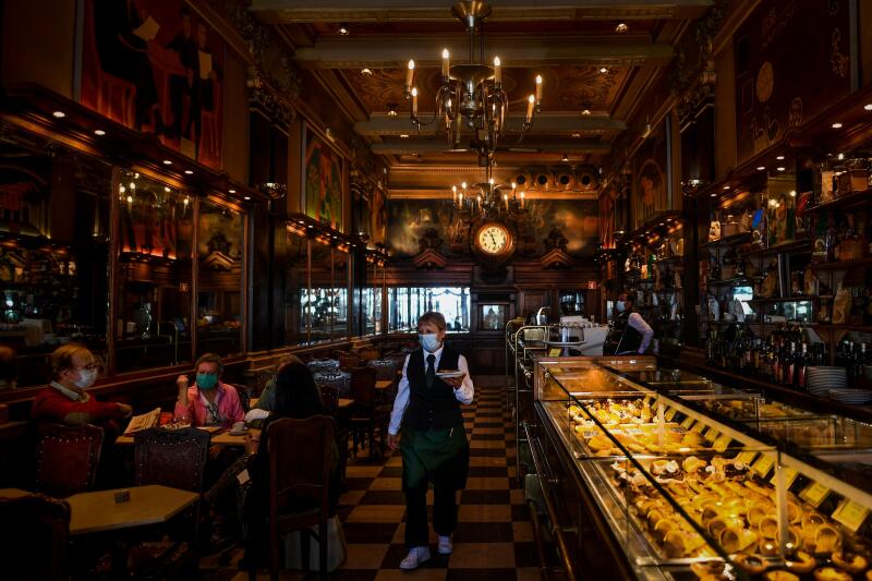 A waitress serves clients at a cafeteria in Lisbon, on May 18, 2020.
