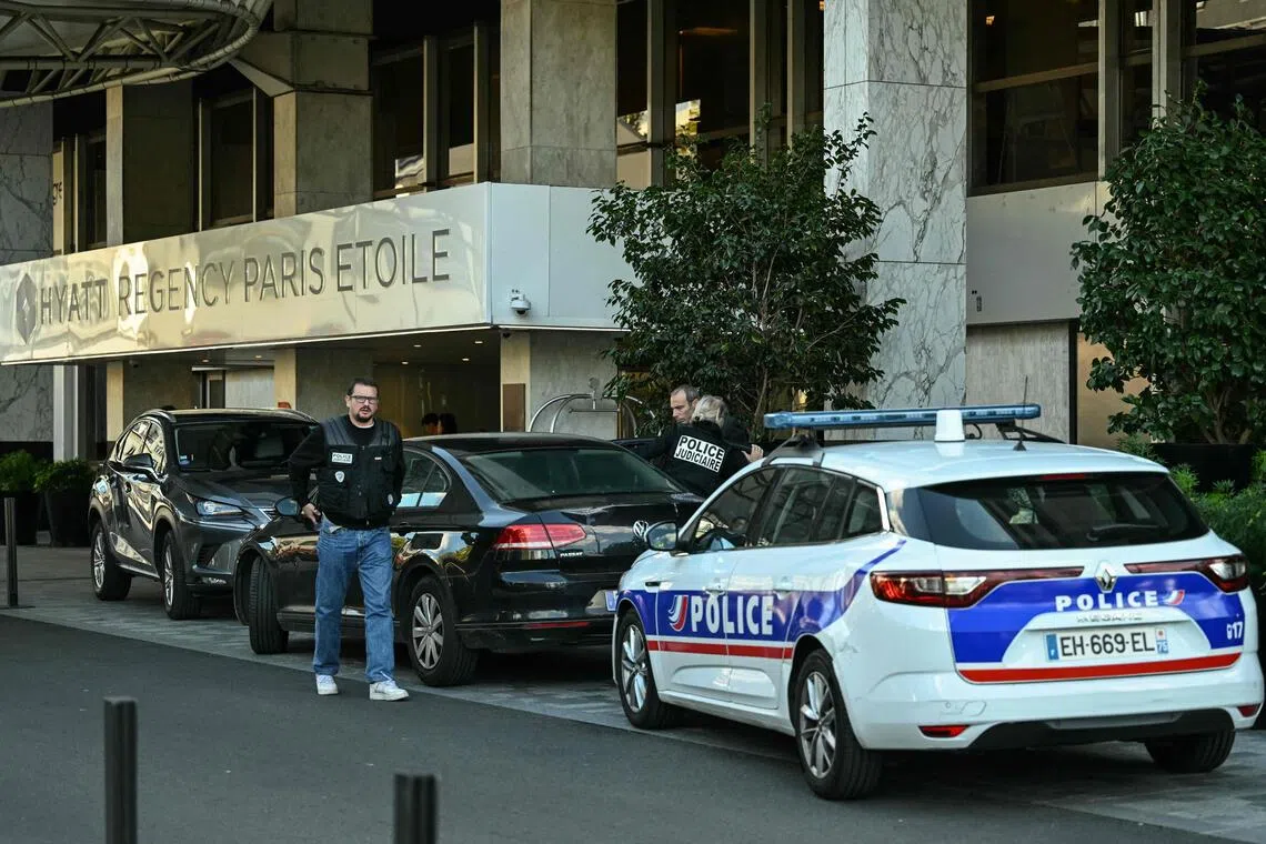 Members of the judiciary police arriving at the Hyatt Regency Paris Etoile hotel, after South Africa’s ambassador to France was found dead at the foot of the hotel on Sept 30.