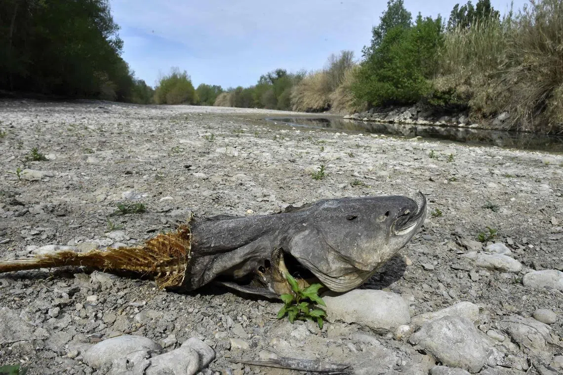 A dead catfish on the dried river bed of the Agly River in Rivesaltes, southwestern France.