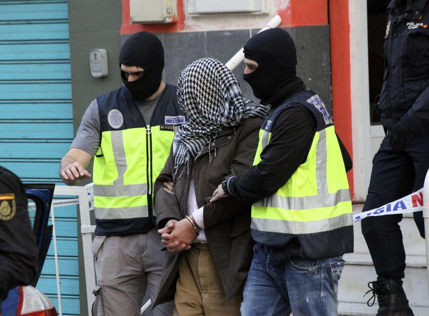 Spanish policemen escorting a man who was arrested during an operation against terrorism in Ceuta, the Spanish enclave in north Africa, on Feb 7, 2016.