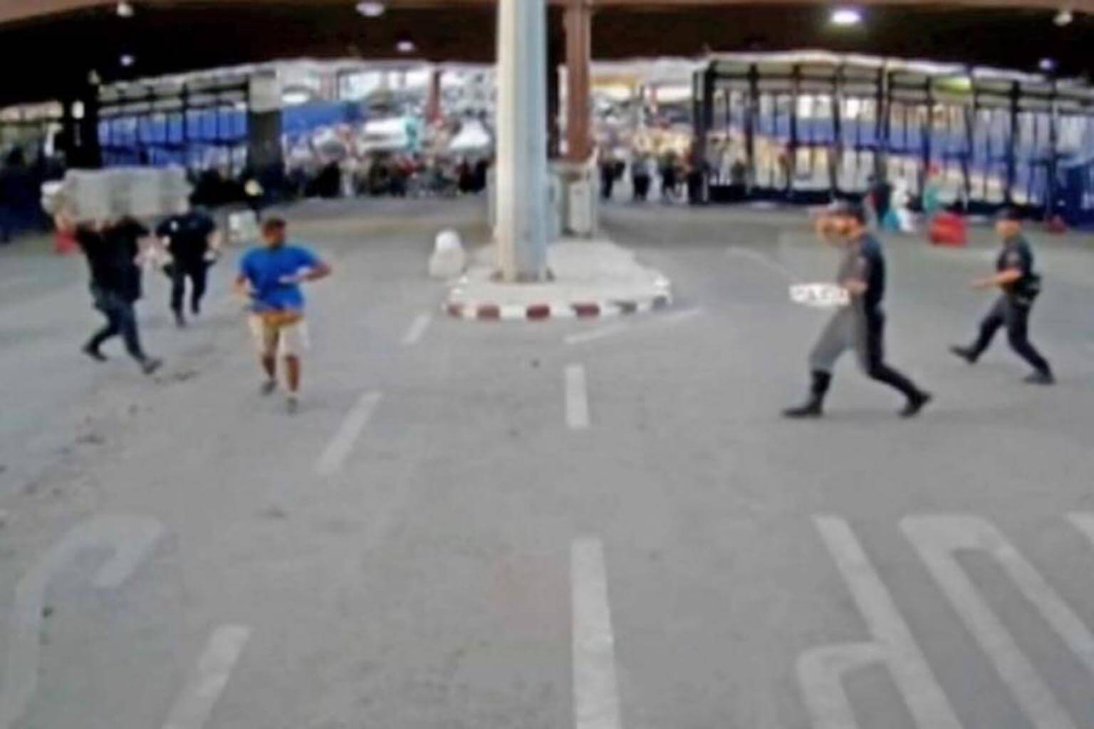 Security camera footage of Tuesday's incident - which authorities say was not a terror attack - showed the man in a blue top walking slowly through a border post between Melilla and Morocco holding a knife, police closing in on him.