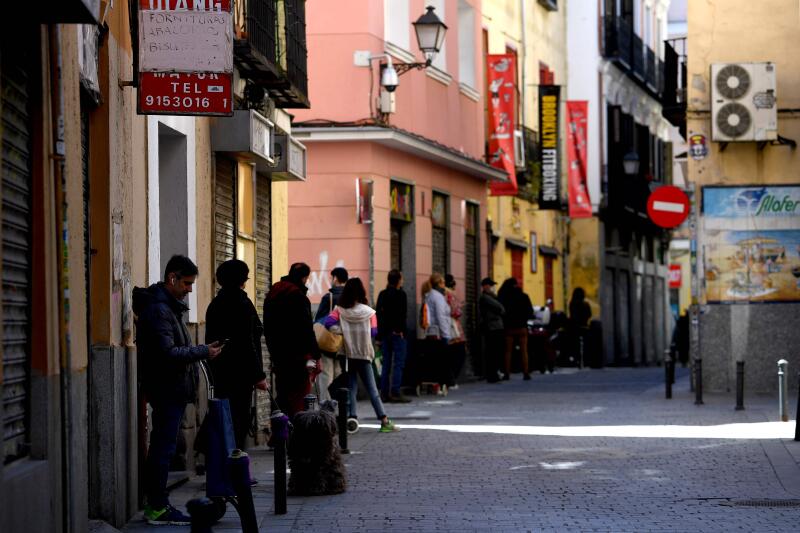 People standing a distance from each other while queueing outside a shop in Madrid, on April 3, 2020.