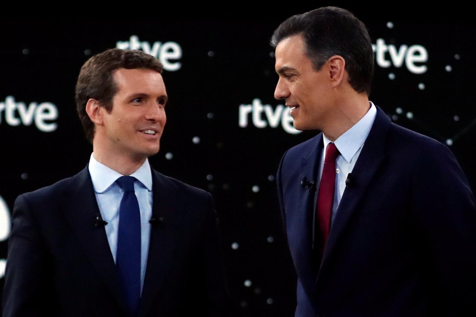 Pablo Casado of the People's Party (left) speaking to Spanish Prime Minister Pedro Sanchez of the Socialist Workers' Party during a debate, on April 22, 2019.
