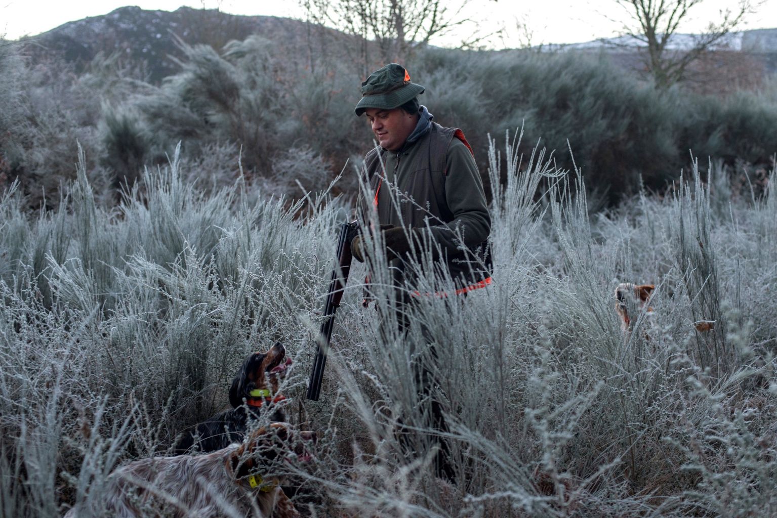 A hunter is pictured with his dog amid frost-covered vegetation in Calvos de Randin, Galicia, Spain, on Jan 6, 2020.