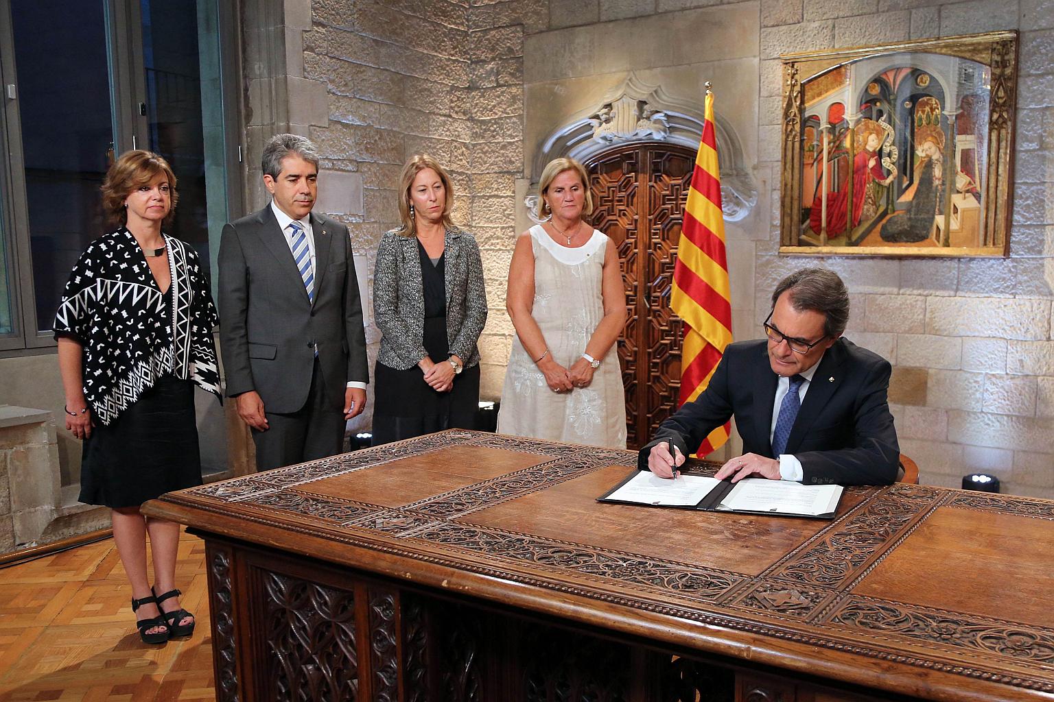 Catalan regional president Artur Mas (left) signing a decree at the Generalitat palace in Barcelona, calling early parliamentary elections.